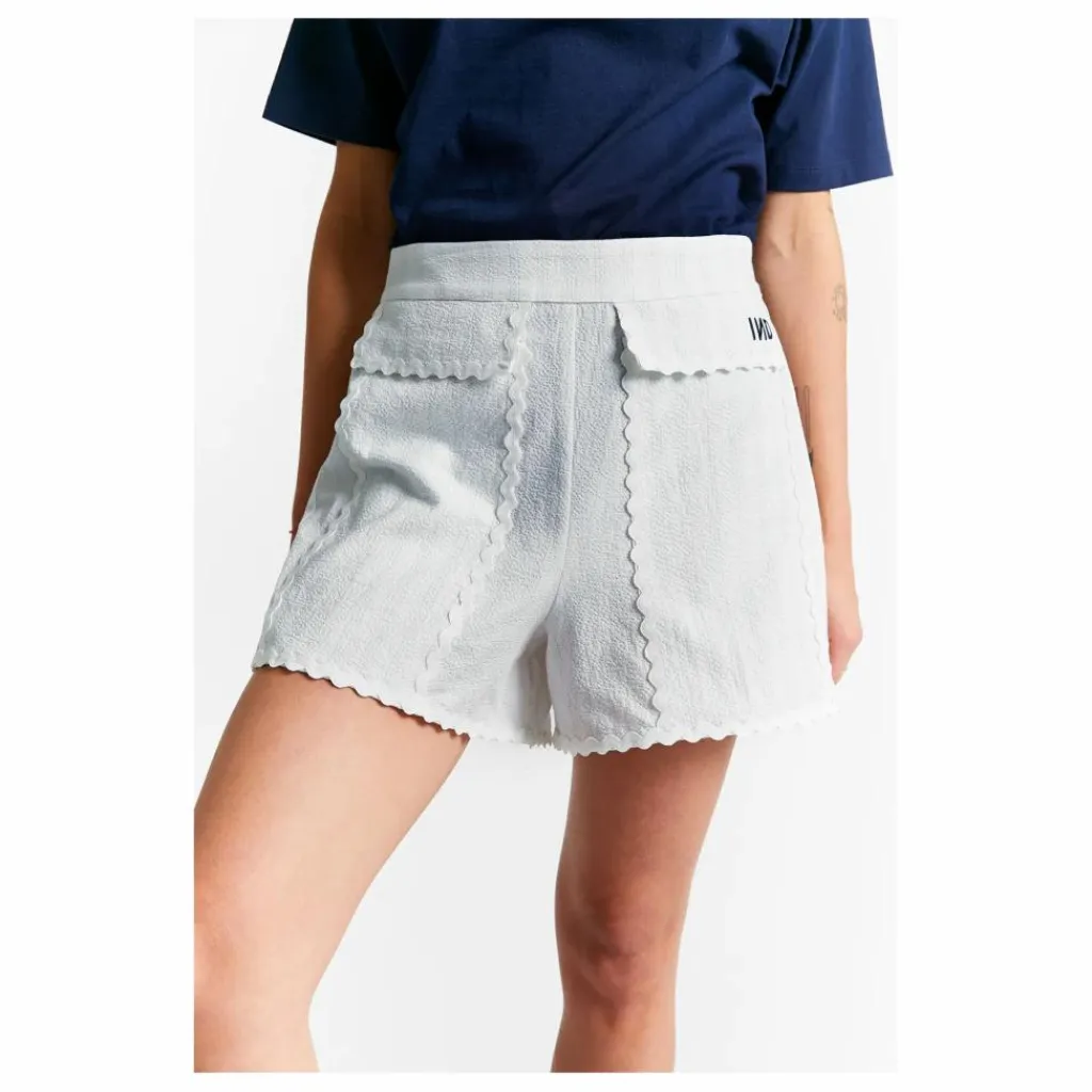 - STATES, en blanc cassé, est un short de style pyjama en coton, élastiqué à la taille, avec des poches plaquées sur le devant et des zigzags blancs sur les bords et les poches. Il est doté de poches plaquées sur le devant et d’une bordure en zigzag blanc le long des bords et des poches. Le logo IND noir est brodé sur la poche latérale gauche.