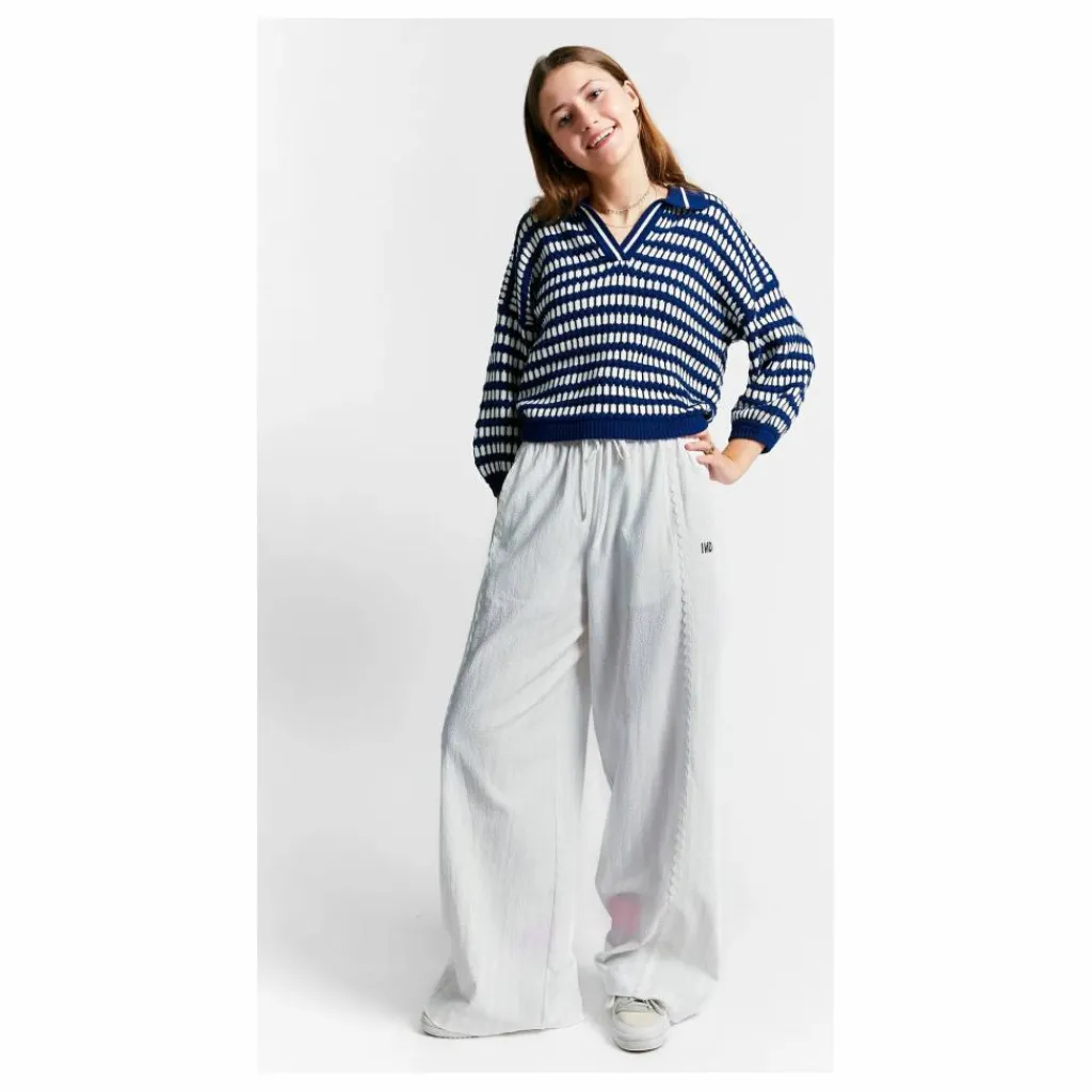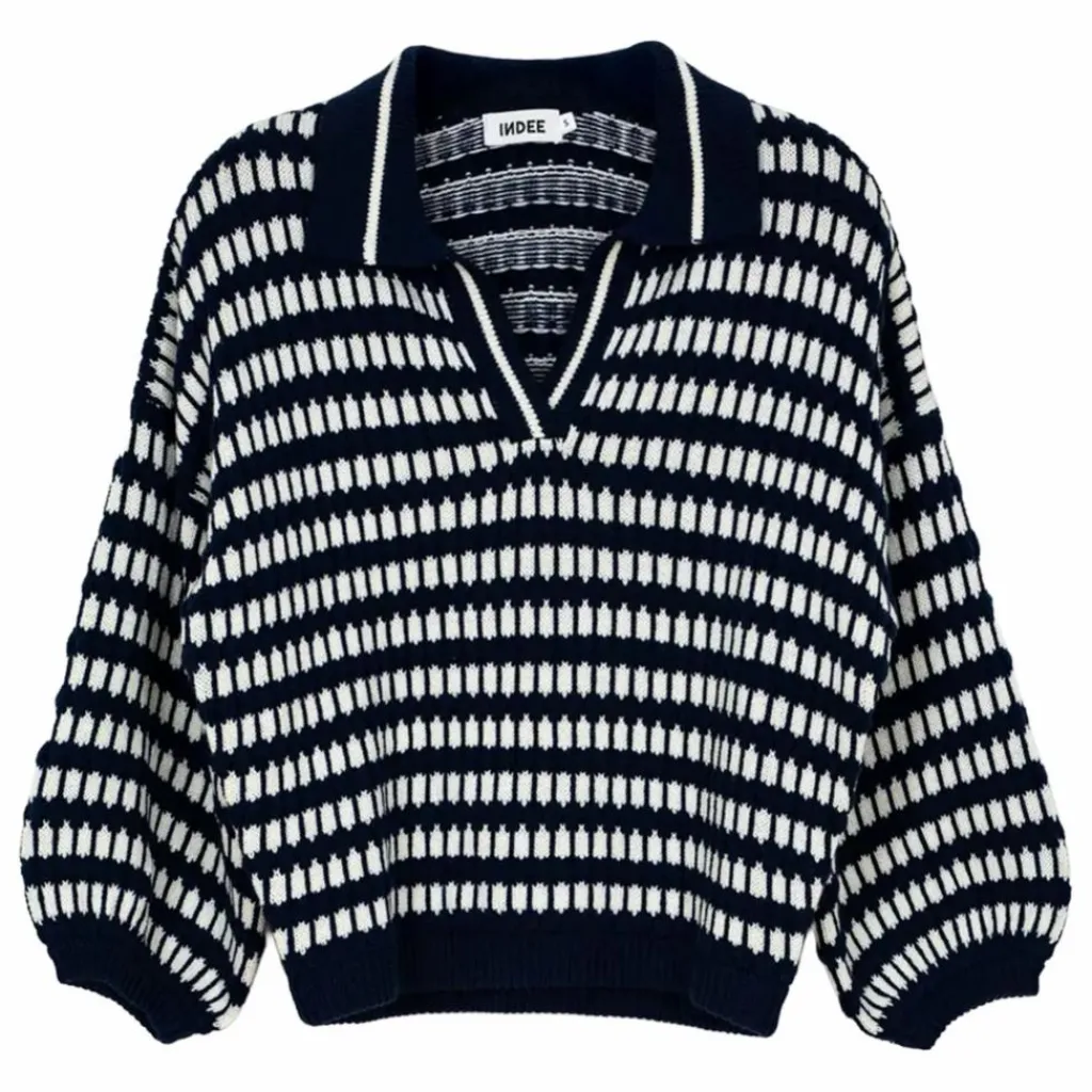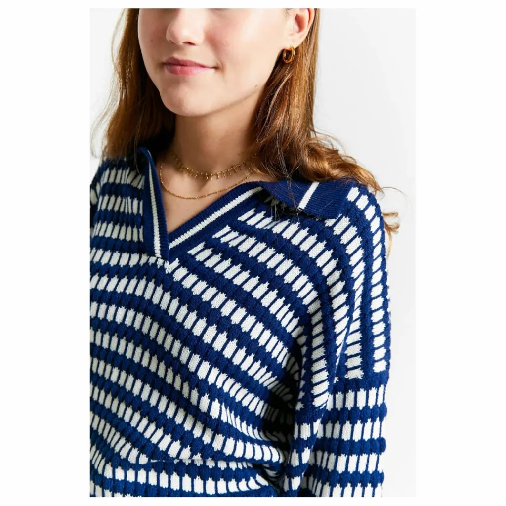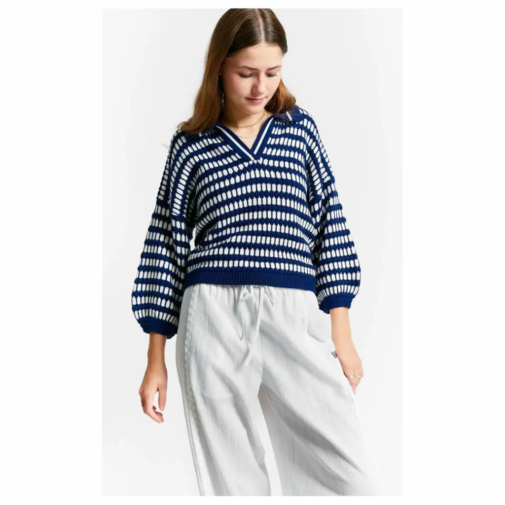 - Pull en tricot polo rayé bleu et blanc à col V et col polo et manches ballon mi-longues.