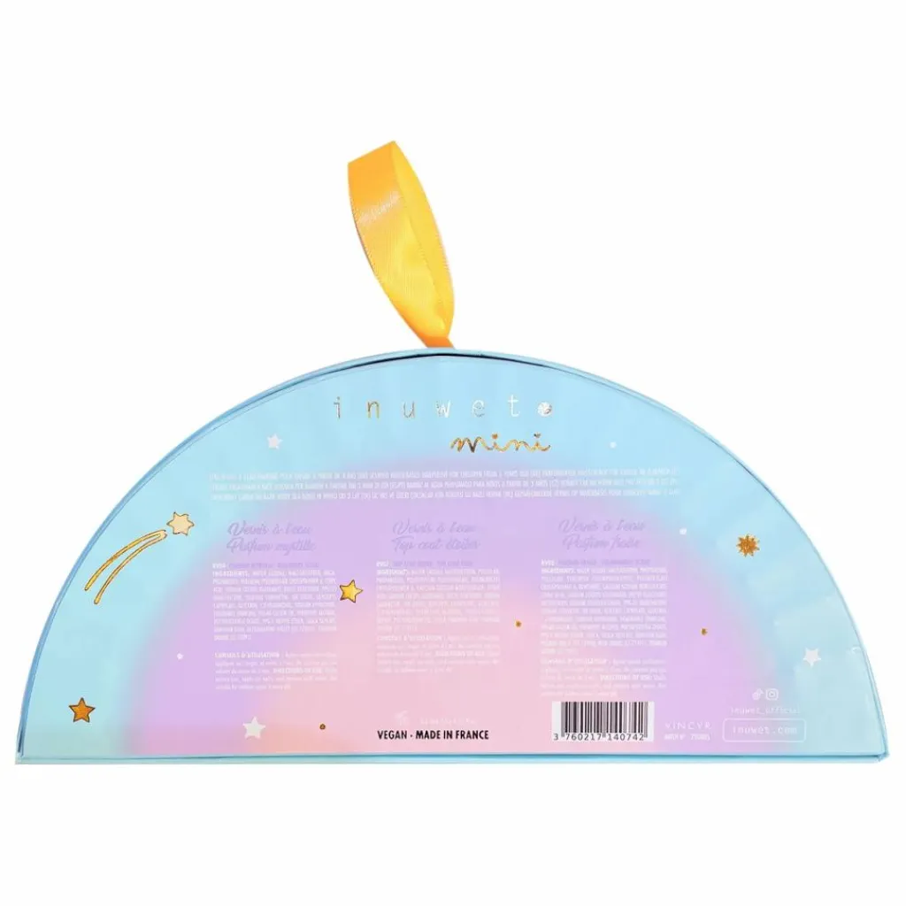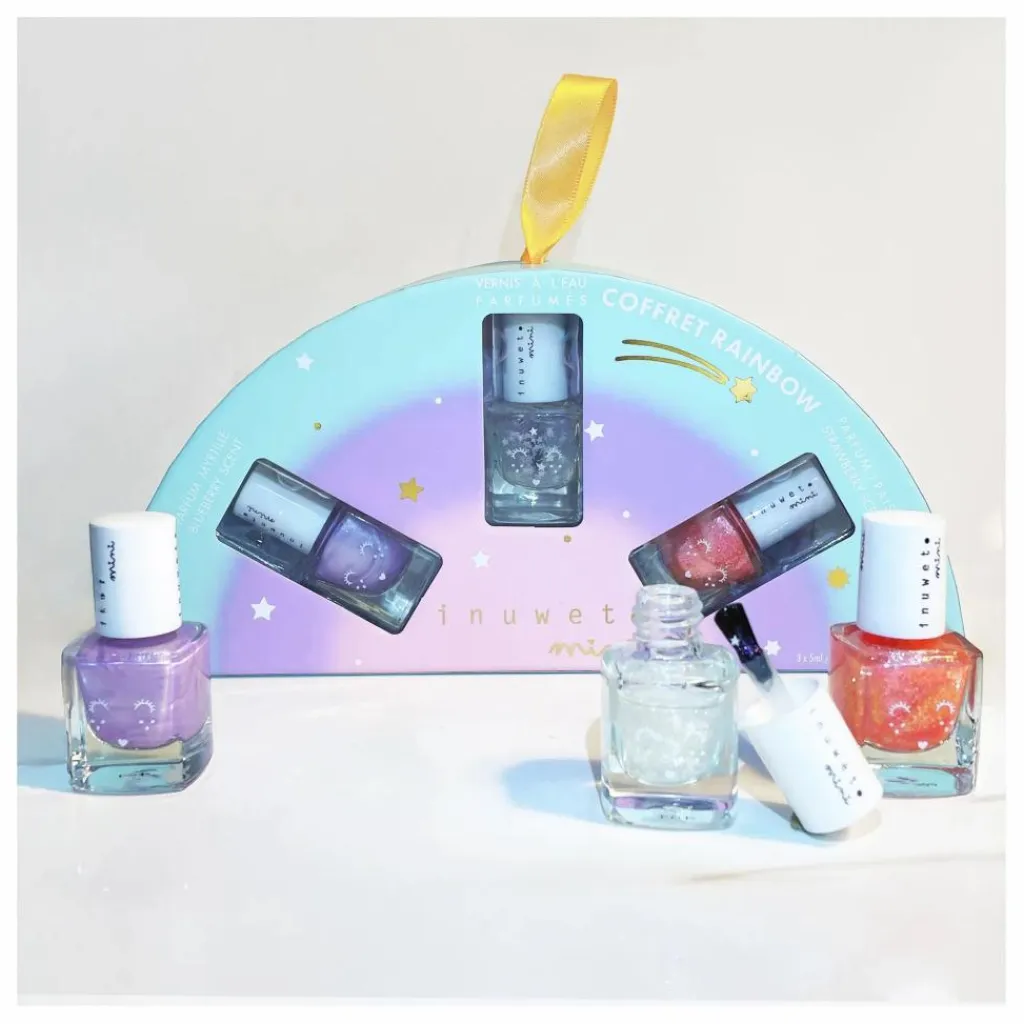 - Un coffret Rainbow qui réunit trois vernis à l’eau pour enfant : un rose parfumé à la fraise, un mauve à la myrtille et un top coat étoilé ! Faciles à appliquer et se retirent à l’eau tiède.