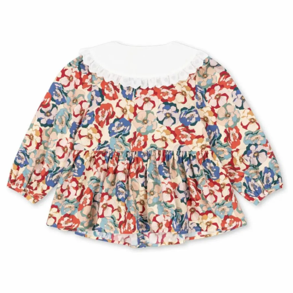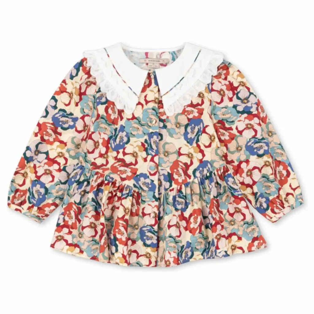 - Chemisier à col rond classique, jupe péplum et manches bouffantes. Boutons recouverts de tissu sur le devant et fronces aux poignets.