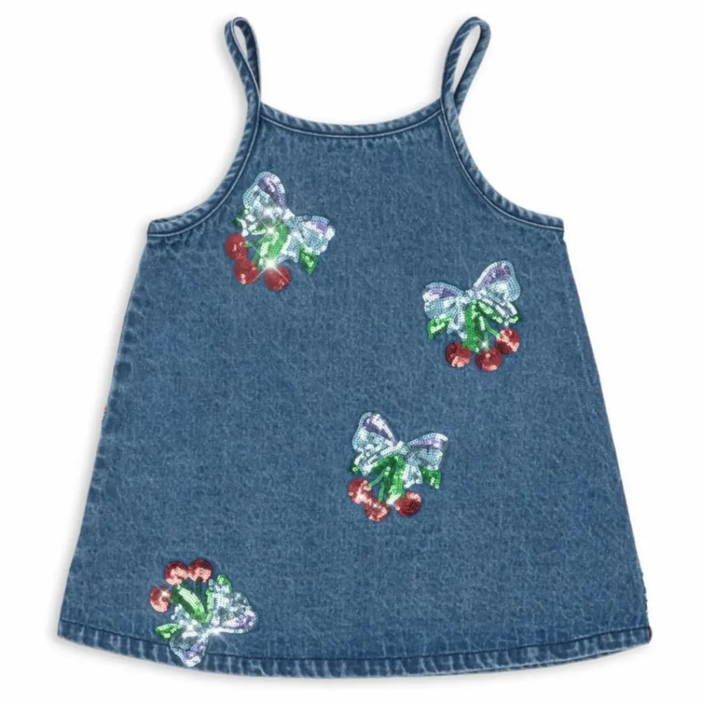 - Robe à bretelles en denim avec nœuds en paillettes brodés. Fabriquée en coton 100% biologique Instructions de lavage : Veuillez laver le produit séparément, car il peut déteindre. GOTS, biologique, certifié par CU1094701