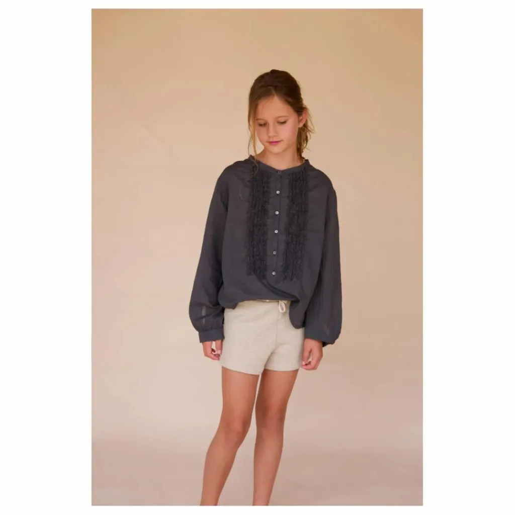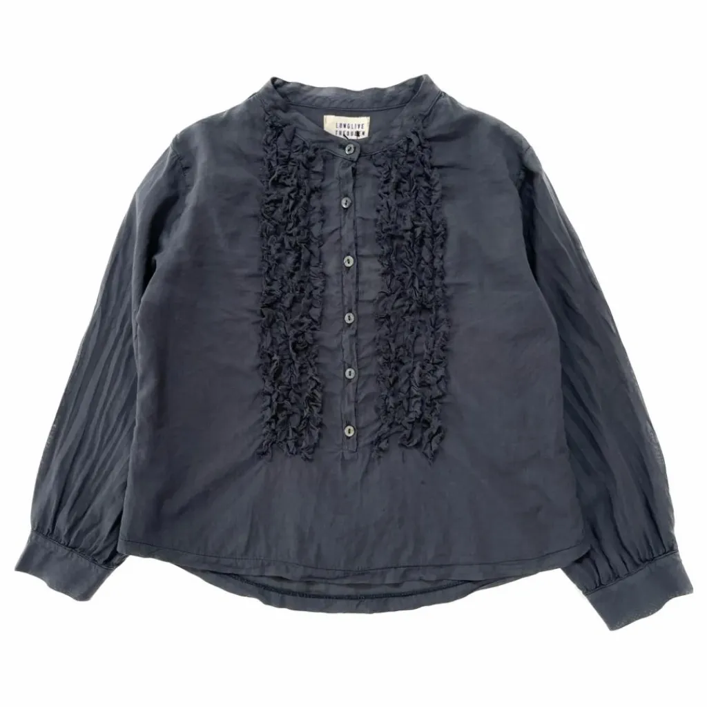 - Resserré aux poignets, Encolure ronde boutonnée, Manches longues bouffantes, Plastron volanté, Arrondi(e) dans le bas, Froufrous, Poignets boutonnés, Poignets froncés