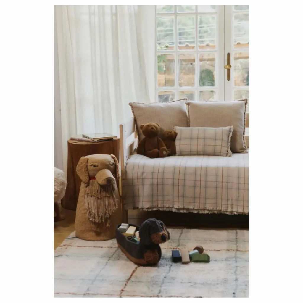 - Voici Luna ! Le tout premier chien de Lorena, né dans son enfance. Ce panier fait main s’inspire de la silhouette d’un Golden Retriever, confectionné à partir de cordons tressés provenant de bouteilles en PET recyclées et de notre coton LC signature. La tête est ornée d’oreilles doublées de toile, d’yeux soigneusement noués à la main, de sourcils touffus pour un regard doux et expressif, et d’un museau interactif avec une langue qui se déroule – oui, un moment de jeu supplémentaire ! Vous pouvez ouvrir et fermer la gueule, et la langue se déroule comme un Golden joyeux qui court partout. Les franges sur le devant et la queue frétillante imitent le pelage duveteux du chien. La queue est flexible, ce qui ajoute à son aspect réaliste et joyeux. Il est livré avec un petit os en peluche attaché à l’étiquette et un collier rouge pour la touche finale charmante.