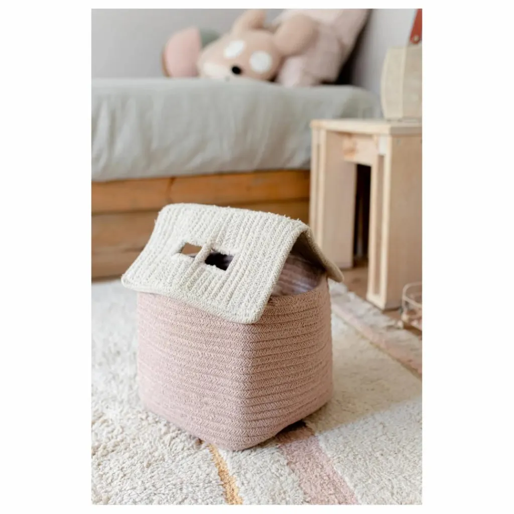 - Panier décoratif en forme de maison. Fabriqué à partir de cordes de coton tressées très épaisses et fabriqué à la main dans une forme carrée, le panier est couronné d’un toit à pignon de couleur contrastée avec des fenêtres découpées. Le toit est fixé à la partie inférieure du panier, laissant une ouverture triangulaire des deux côtés, qui sert d’ouverture de rangement.