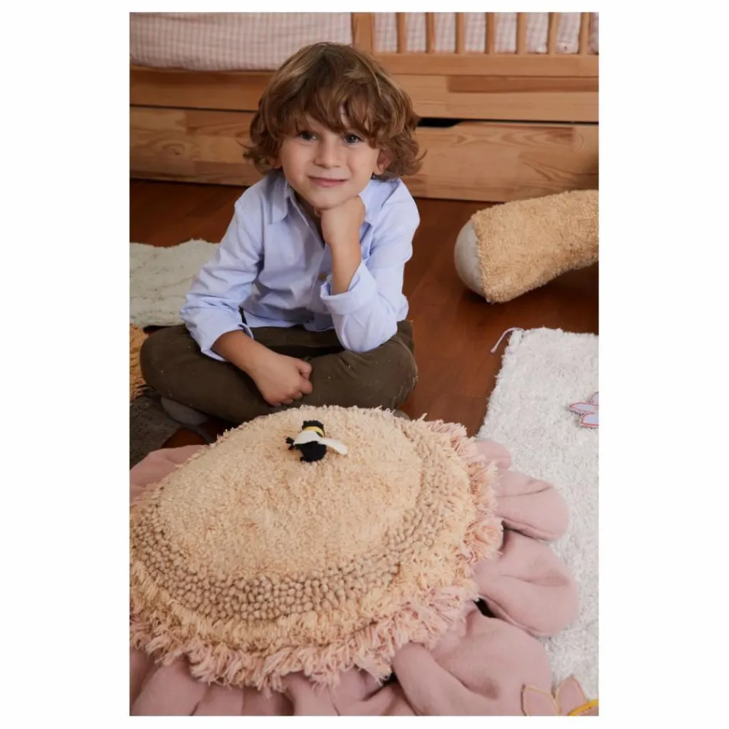 - Notre coussin de sol Pink Daisy est un coussin généreux en forme de fleur. Avec de grands pétales roses en toile de coton tout autour, le coussin présente un centre en coton touffeté, en chenille dorée mélangée à des rangées de poils plus longs pour créer la surface texturée du milieu d’une fleur.