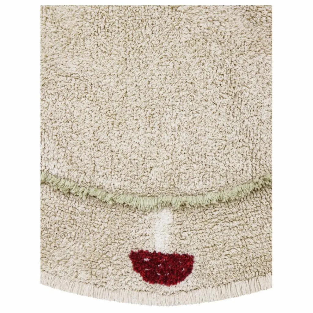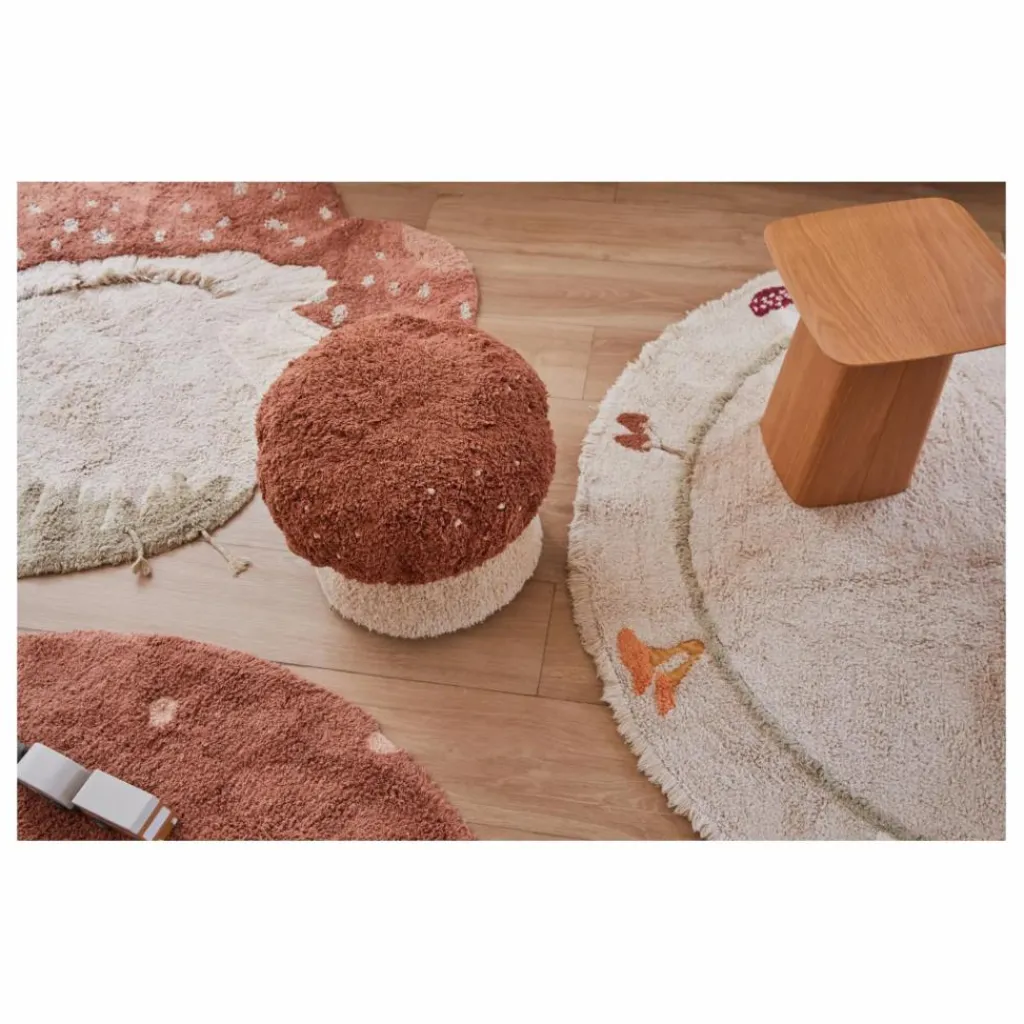 - Le tapis rond Chanterelle est décoré d’une bordure de différentes espèces de champignons comme les girolles et les morilles, associant des morceaux de toile à des motifs touffetés. Le tapis a une base naturelle, un cercle intérieur de poils légèrement plus longs en olive et des détails design en miel, bordeaux, caramel et ivoire.