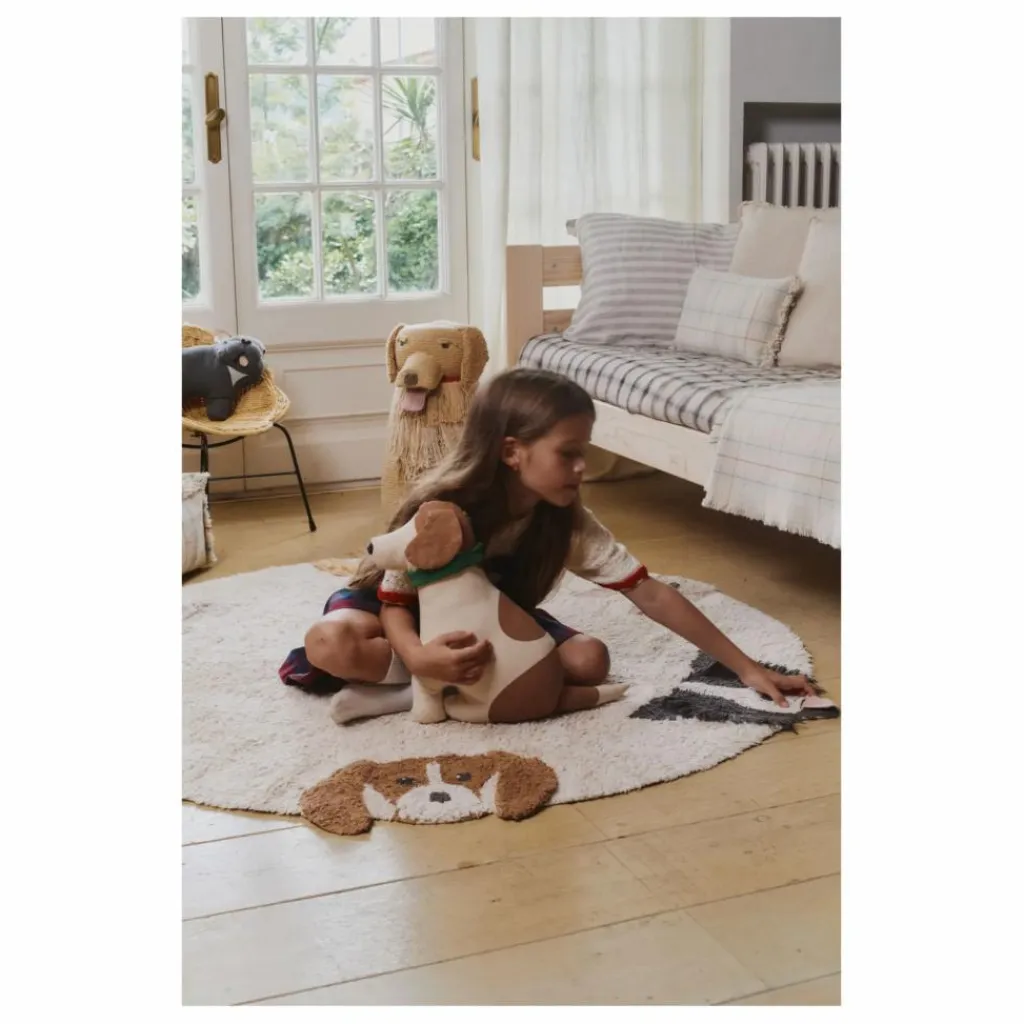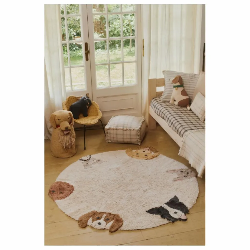 - Découvrez vos six compagnons à quatre pattes préférés ! Un tapis rond lavable aux couleurs naturelles, orné des visages amicaux de différentes races de chiens adorables. Chaque chien est fabriqué à la main et présente des détails uniques comme des oreilles en 3D, des langues interactives, des moustaches, des barbes et des yeux noués pour un effet réaliste. Un design artisanal et interactif qui invite les petits à découvrir, explorer et sourire !