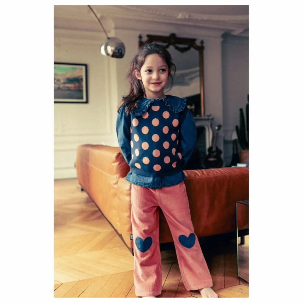 Détails : Jean patte d’eph, taille élastiquée, genouillére en forme de cœur imprimé fleuri.