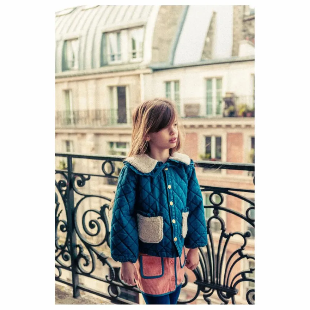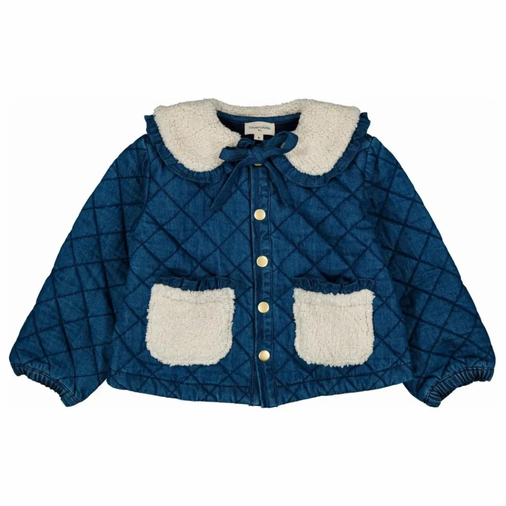 Détails : Veste en denim matelassé, bien chaude, entiérement doublé, col et poches en fausse fourrure, boutons pressions dorés sur le devant.