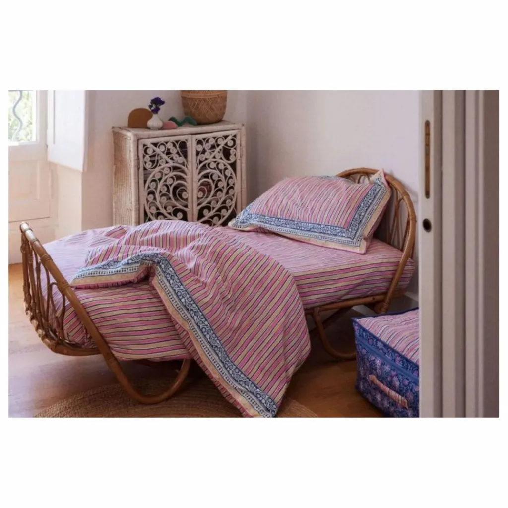 Taie d’oreiller en percale de coton avec frise sur les contours sauf pour la plus petite taille.