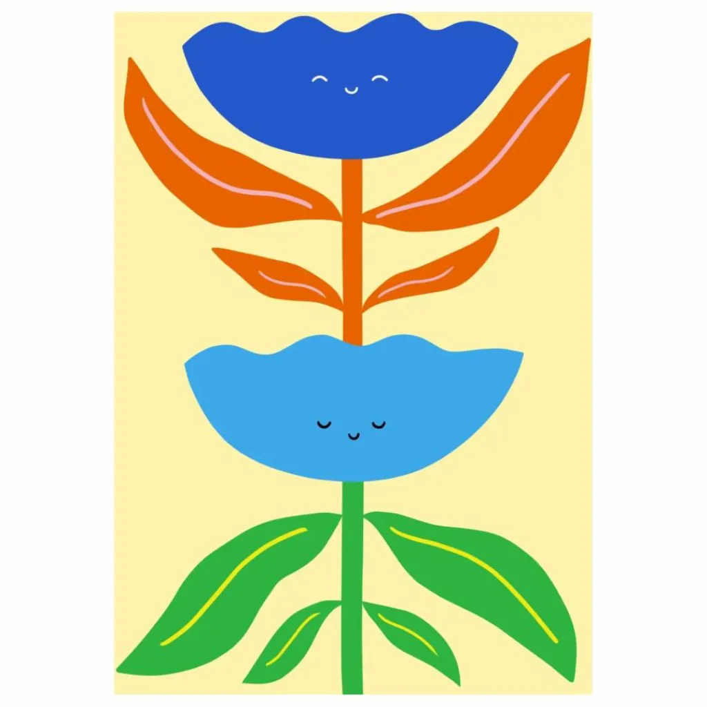 L’artiste Marina Ayashiro, basée à Osaka, a créé sa collection de fleurs joyeuses pour apporter de la gaieté à votre intérieur. Hi Flower 02 met en scène un personnage coloré dans des teintes riches de lavande, d’orange et de jaune, sur un fond violet éclatant.