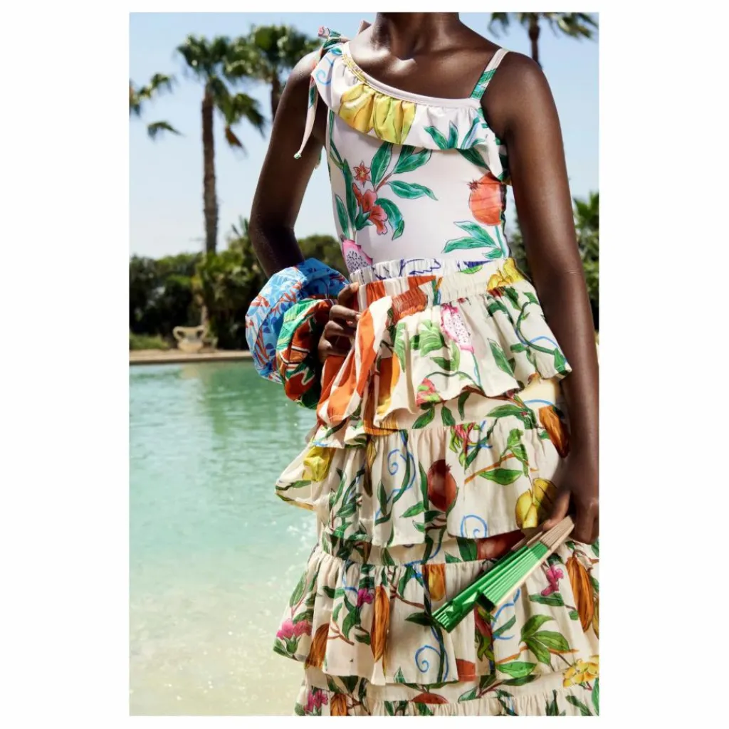 - Le maillot de bain passion fruit écru est un maillot de bain élastique avec un imprimé passion fruit. Il a une encolure irrégulière avec des volants amusants autour de l’encolure et un symbole de la marque brodé sur le devant. 88% Pes rec 12% Ea. Fabriqué au Portugal.