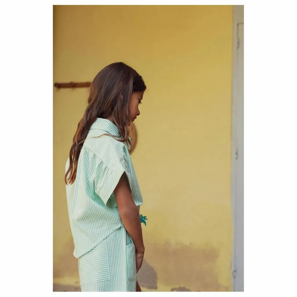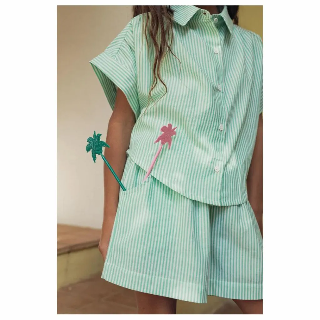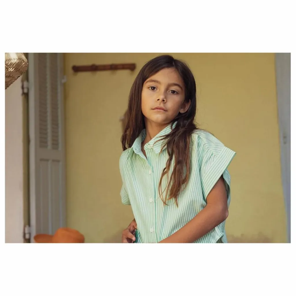 - Coton haute qualité imprimé fines rayures vertes- Coupe ample – col chemise -manches courtes avec revers cousu – manches tombantes – fronces sur l’épaule- boutonnage nacre – bas arrondi