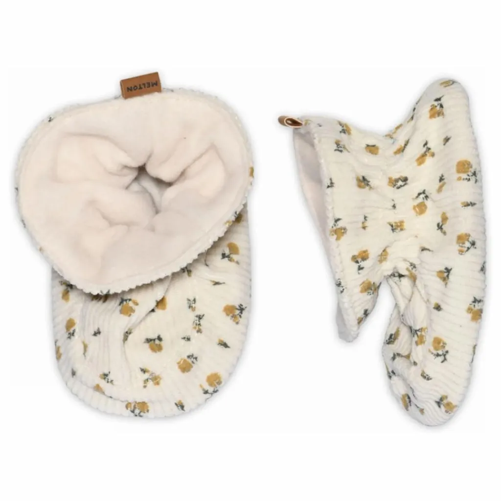- Pantoufles en textile souple de MELTON avec une doublure en polaire douce. Les pantoufles donnent à l’enfant une totale liberté de mouvement et peuvent être resserrées à l’aide d’un cordon sur le cou-de-pied pour un ajustement optimal. Sous la semelle, les pantoufles sont recouvertes de crampons en caoutchouc pour assurer une bonne adhérence au sol.