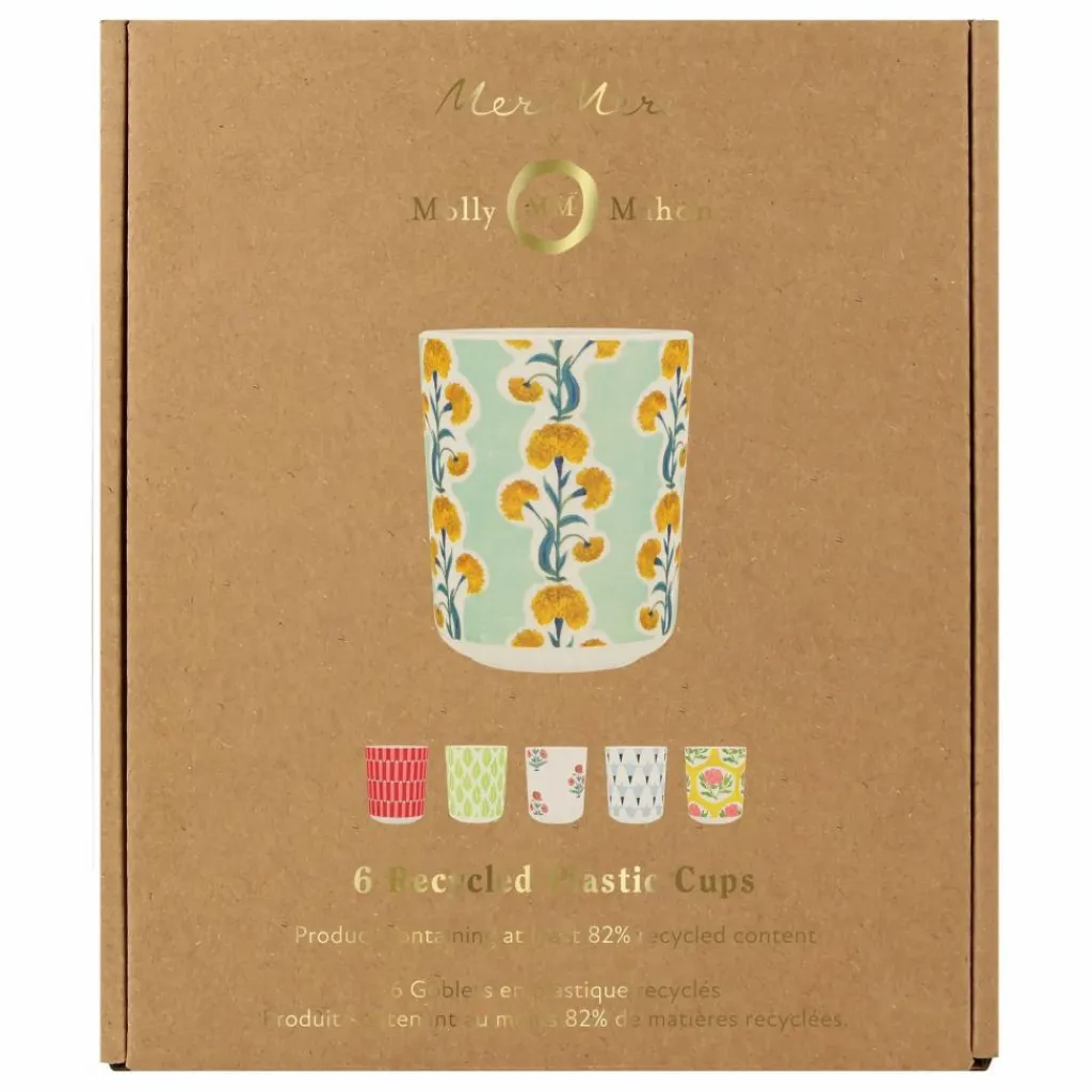 - Nous avons collaboré avec la célèbre graveuse britannique Molly Mahon, en utilisant ses motifs pour créer une magnifique collection de fête bohème. Cet ensemble de gobelets en plastique recyclé réutilisables ajoutera du style à n’importe quelle fête.