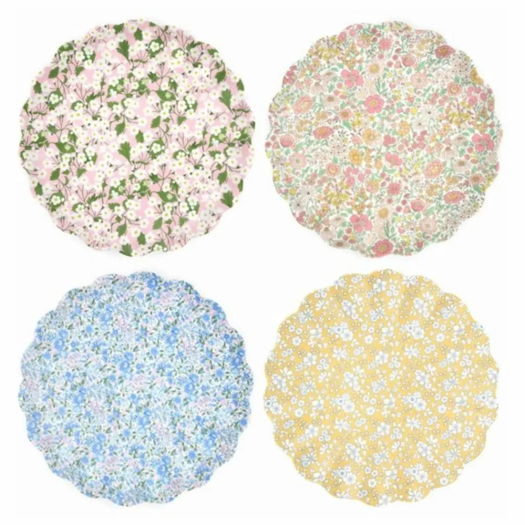 - Assiettes en mélamine (composées de 70 % de mélamine et 30 % de cellulose) avec impression par transfert et forme de pétoncle moulée. Chacune des assiettes a un motif imprimé Liberty différent, avec des couleurs qui conviendront à toutes les célébrations.. Les assiettes sont enveloppées dans du papier de soie blanc avant d’être emballées