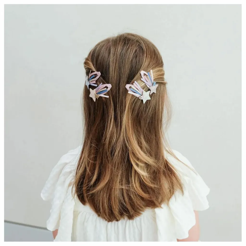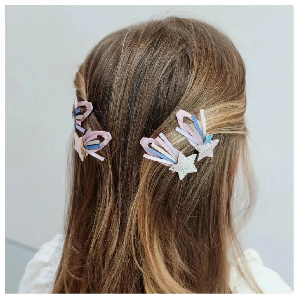 - – 4 par paquet – Attaches clic clac de 5 cm entourées d’un ruban de satin – Étoiles fabriquées à partir de tissus pailletés et métallisés et surmontées d’une traînée de rubans arc-en-ciel