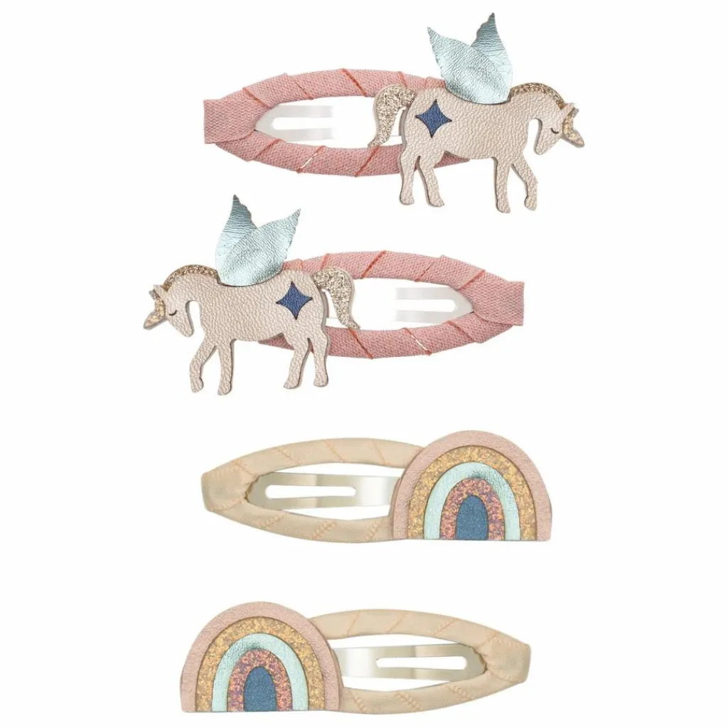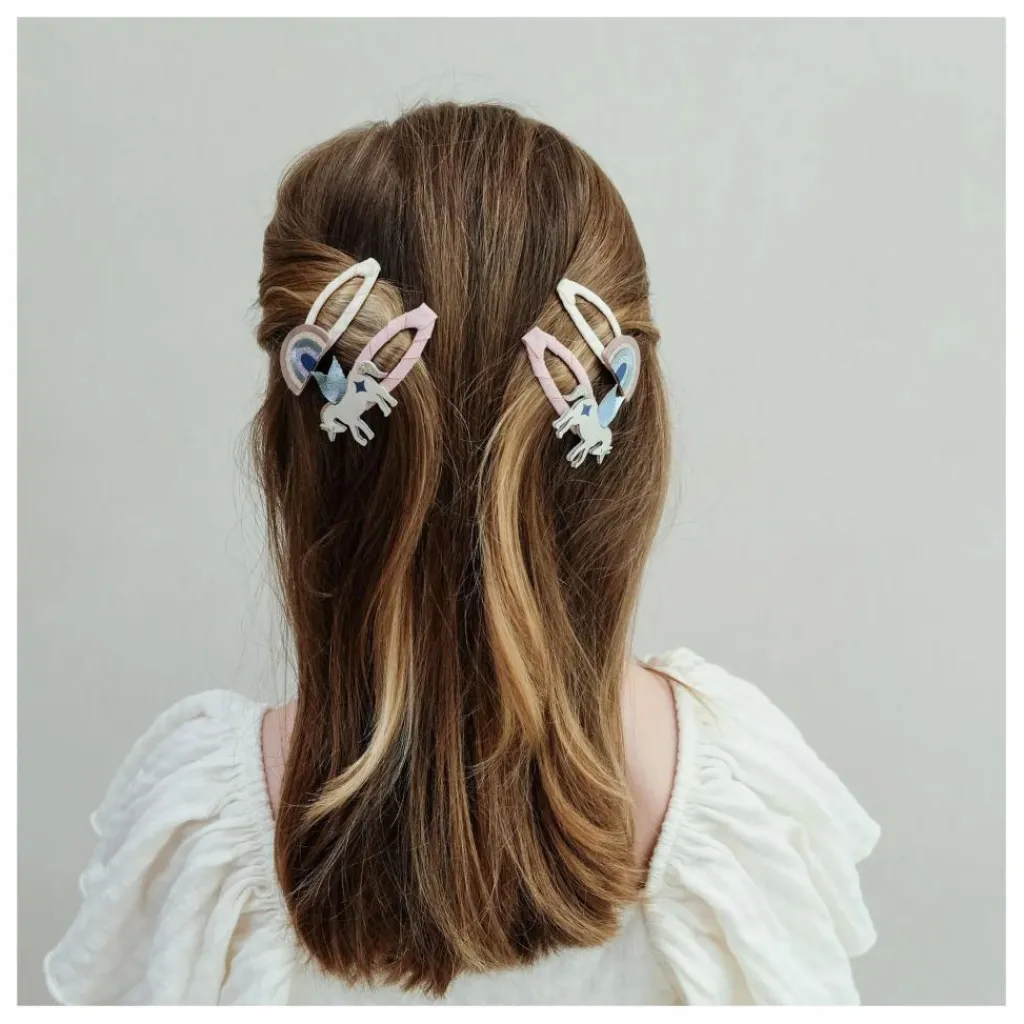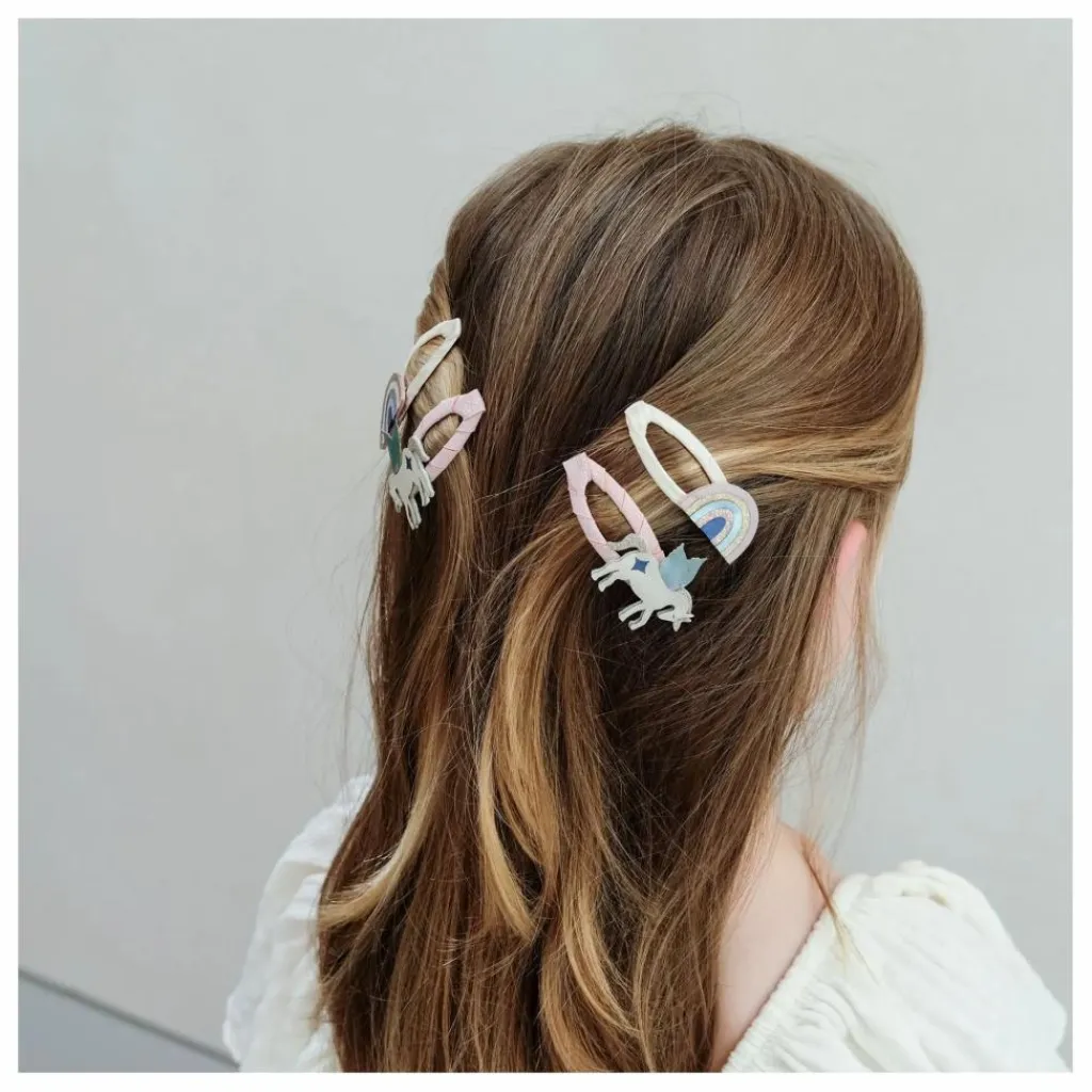 - Ajoutez un peu de magie mythique à leurs cheveux avec nos clic clacs licorne ailée et arc-en-ciel ! Deux gracieuses licornes métalliques et deux superbes arcs-en-ciel composent le plus beau pack de clips qu’elles adoreront à coup sûr.