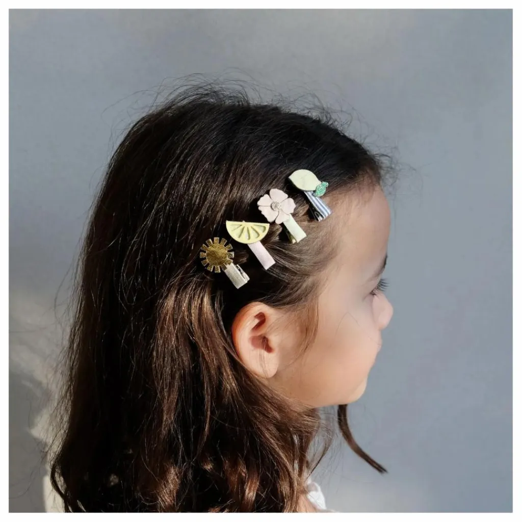 - Ces adorables mini-clips Amalfi nous font rêver de journées ensoleillées et de paysages pittoresques… que vous restiez à la maison ou que vous partiez en avion, ce magnifique petit paquet de clips ajoutera un charme estival à toutes vos tenues ! 8 par paquet Clips crocodiles recouverts de tissu Citrons, fleurs et soleil, tous fabriqués à partir d’un joli mélange de suède doux, de paillettes et de tissus métalliques Attention ! Ne convient pas aux enfants de moins de 36 mois