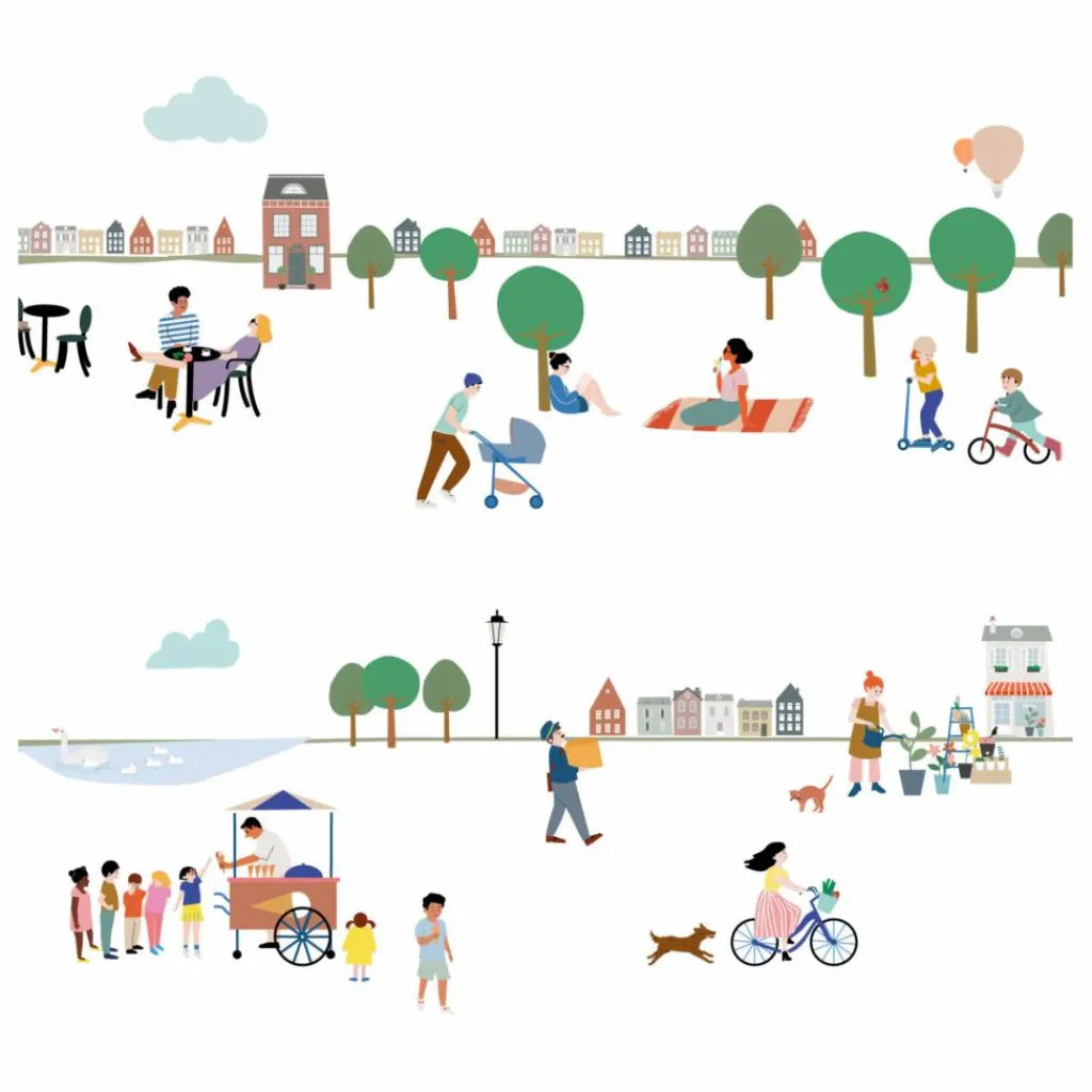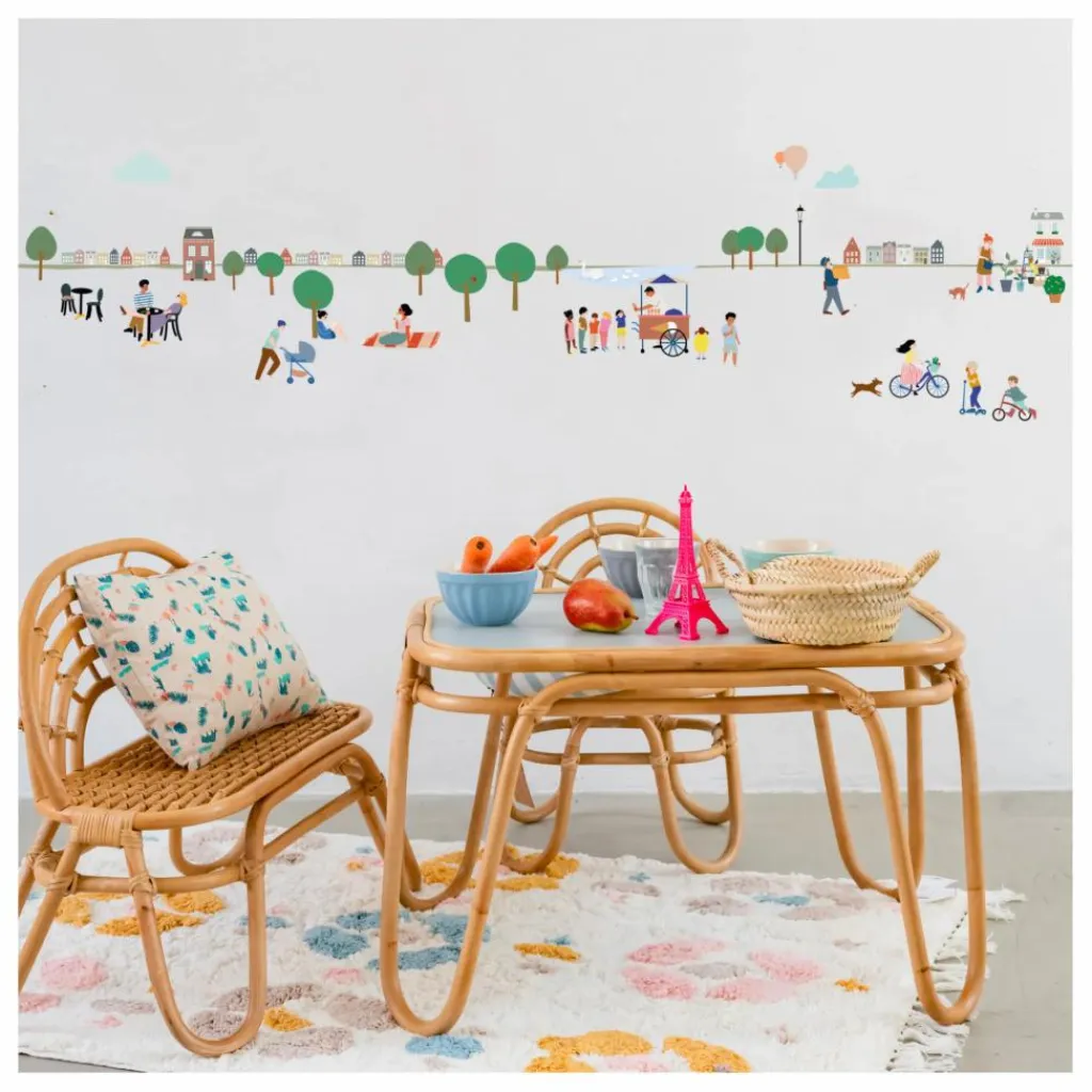 Cette superbe frise apportera une touche de couleur et de fantaisie à la chambre de votre enfant ! Le thème « Mon Village » est inspiré du livre « Où est Charlie », et du concept « such und finde » allemand où les enfants partent à la recherche de petits objets dans un décor riche et animé.