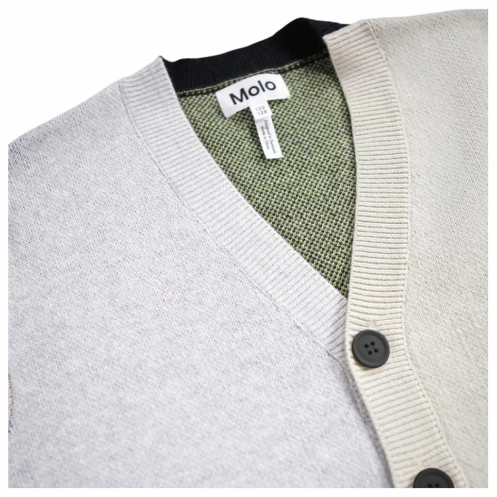 - Ce cardigan tricoté multicolore de Molo est fait de coton et de laine et présente une encolure en V, des boutons, une patte de boutonnage côtelée et des bords côtelés autour des manches et de la taille. Le cardigan a une coupe régulière et un motif de divers graphiques, ainsi qu’un grand alien dans le dos.