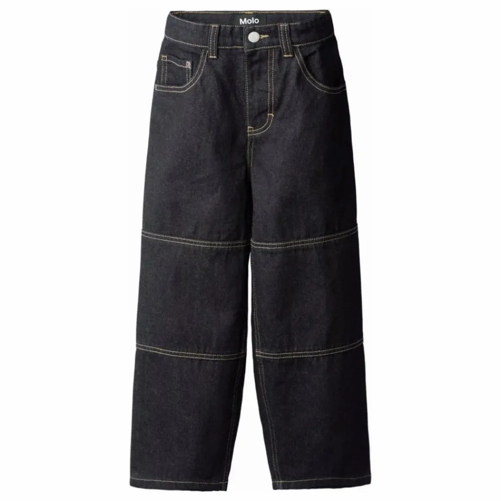 - Ce jean Molo surdimensionné bleu foncé est en denim brut avec de légères surpiqûres aux genoux. Il a cinq poches, des passants de ceinture et une coupe oversize. La taille peut être ajustée à l’aide d’un élastique interne pour un ajustement optimal à tous les enfants. Les tailles 92-134 sont dotées d’un bouton pression, tandis que les tailles 140-176 sont dotées d’un bouton de jean classique. Il est recommandé de choisir une taille plus petite pour une coupe moins ample, surtout si l’enfant est entre deux tailles.