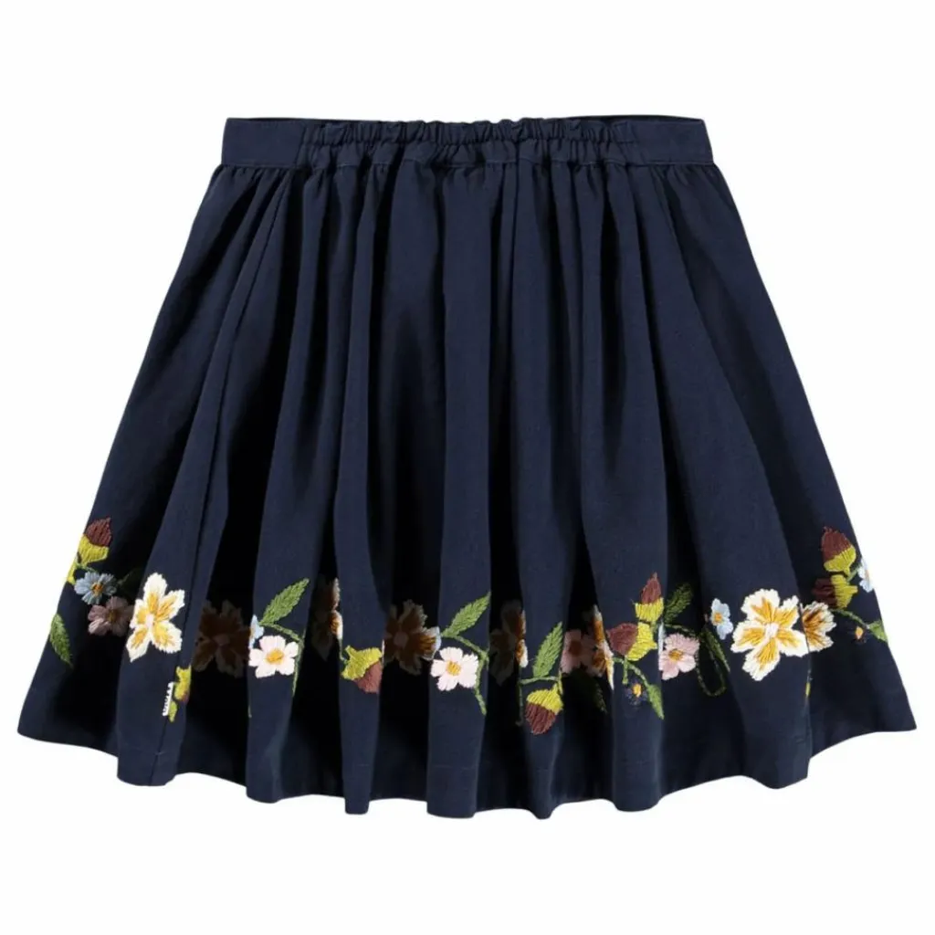 - Cette jupe bleu foncé de Molo est réalisée en sergé de coton et brodée de fleurs et de noix. La jupe descend jusqu’au genou et possède une ceinture fixe sur le devant et élastique à l’arrière, ce qui la rend facile à enfiler et confortable à porter.
