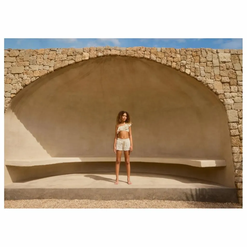 - Ce bikini est extensible et fabriqué à partir de polyester recyclé, ce qui garantit le confort des enfants actifs. Le haut est orné de délicats volants asymétriques et d’une sangle réglable pour un ajustement parfait, tandis que le bas, entièrement doublé, offre une couverture fiable. La protection UV intégrée en fait le choix idéal pour les journées ensoleillées passées à barboter.