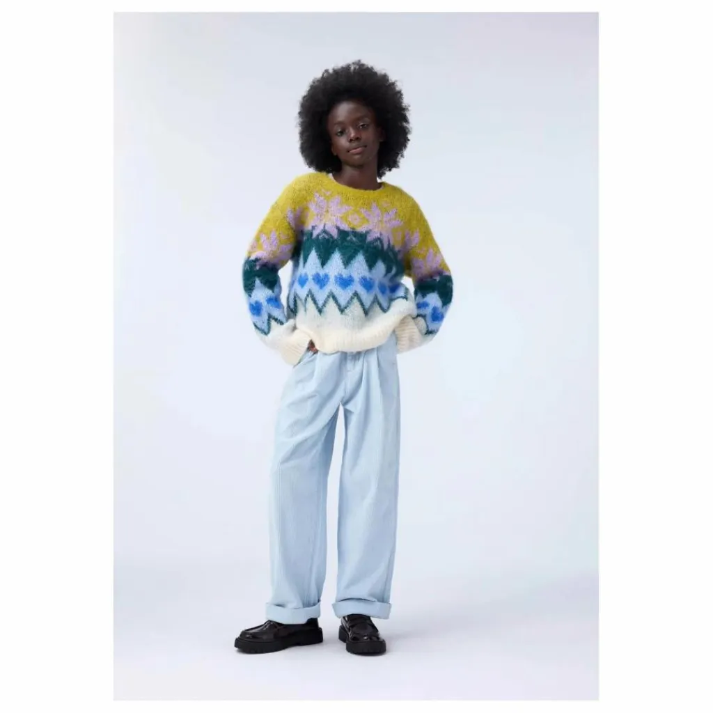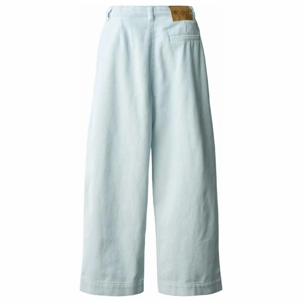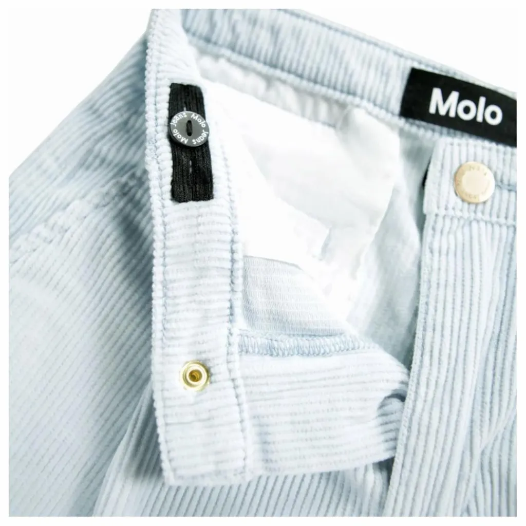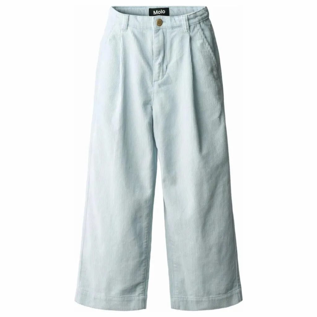 - Ce pantalon bleu clair de Molo est confectionné en velours de coton doux et présente une coupe ample. Il présente une taille légèrement haute, des jambes larges et des plis sur le devant qui créent une jolie silhouette. Il est doté de deux poches latérales et d’une poche arrière. La taille est dotée d’une fermeture à bouton et à glissière et d’un élastique interne réglable pour un bon ajustement.