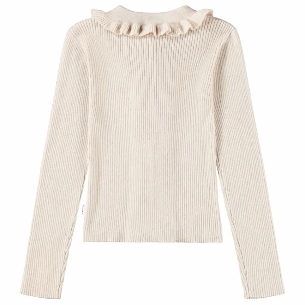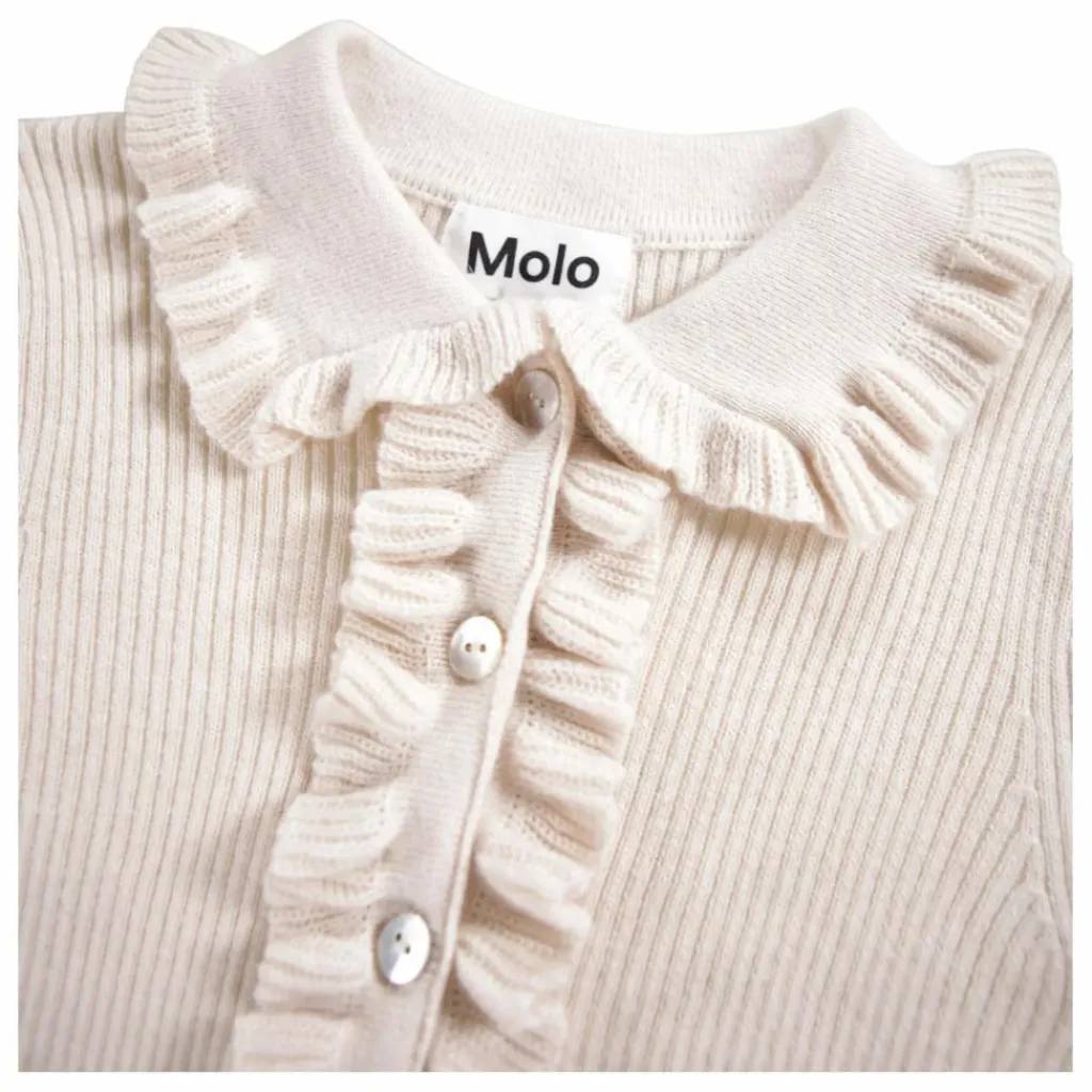 - Ce joli cardigan blanc cassé de Molo est ajusté et composé d’un mélange de laine et de coton. Il est doté d’un joli col à volants et de volants le long de la fermeture à boutons sur les deux côtés. Il est côtelé et doté de magnifiques boutons en nacre.