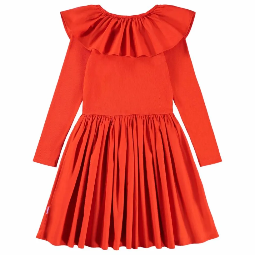 - Cette robe rouge au genou de Molo est fabriquée en coton biologique. Elle se compose d’un haut ajusté en jersey et d’une jupe volumineuse en popeline de coton. Elle est dotée de manches longues et d’un large col en popeline qui peut être porté à l’épaule.