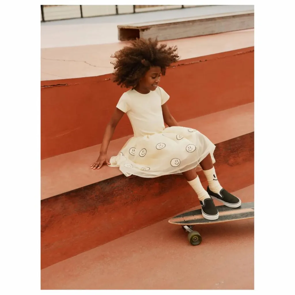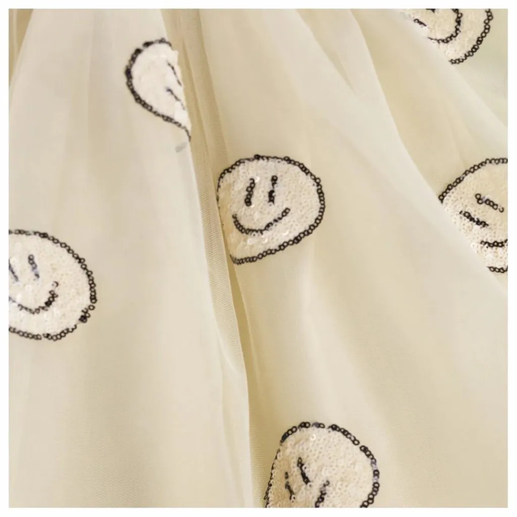 - Robe à manches courtes avec jupe en tulle ornée de visages en paillettes brillantes. Le corsage ajusté est fabriqué en jersey de coton doux et côtelé, avec une encolure ronde. La jupe au genou est doublée d’un jupon confortable en coton, ce qui garantit un port agréable pour s’amuser et jouer toute la journée.