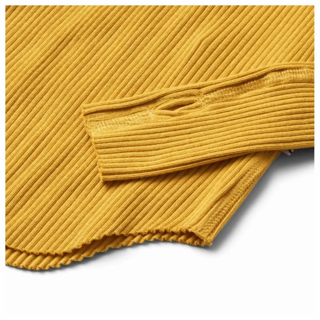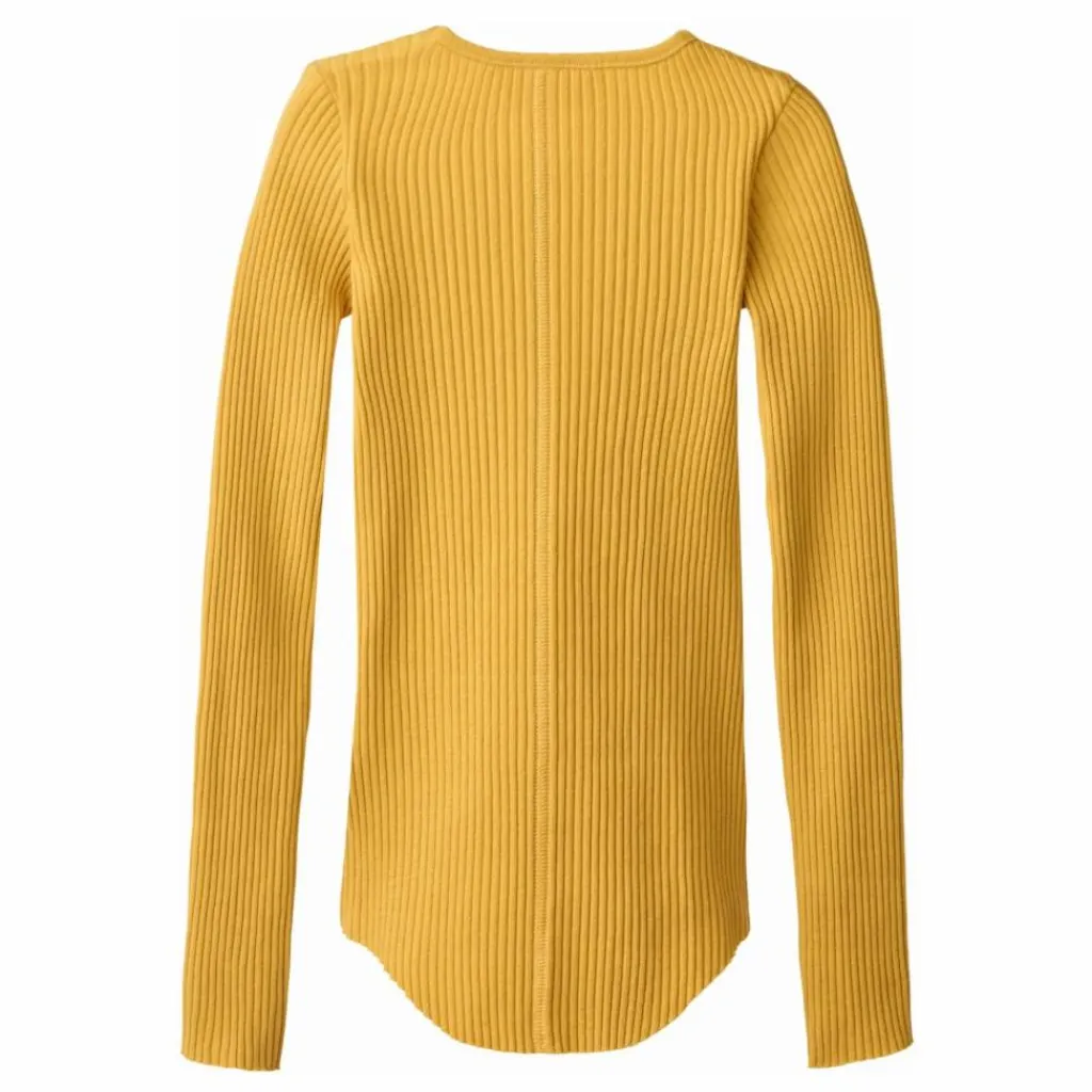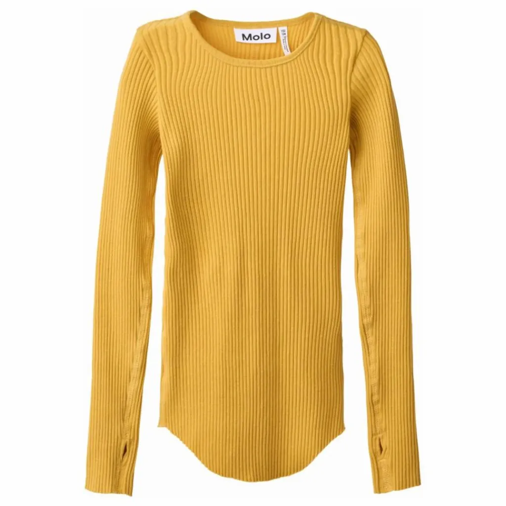 - Ce haut jaune à manches longues de Molo est fabriqué en côte de coton biologique extensible et présente une coupe près du corps. Il présente une encolure ronde, des bords bruts sur les deux manches avec des trous pour les pouces, une couture verticale au milieu du dos et un bord brut arrondi à la taille.