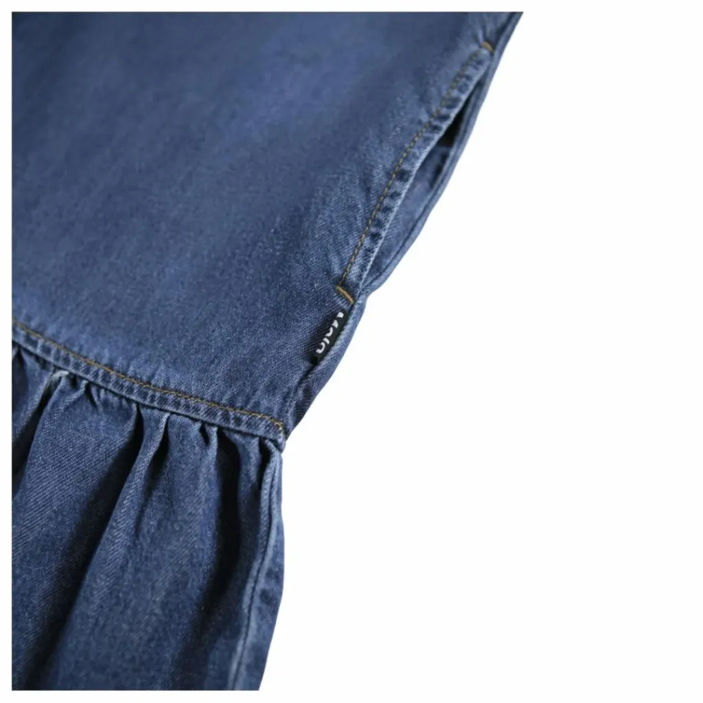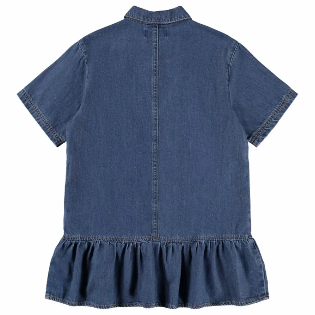 - Cette robe en denim bleu à manches courtes de coupe oversize de Molo se ferme par un bouton, comporte une petite poche sur le devant et une petite jupe à volants attachée.