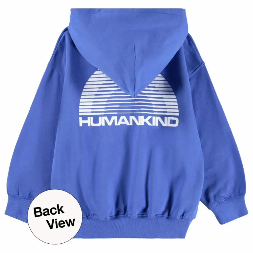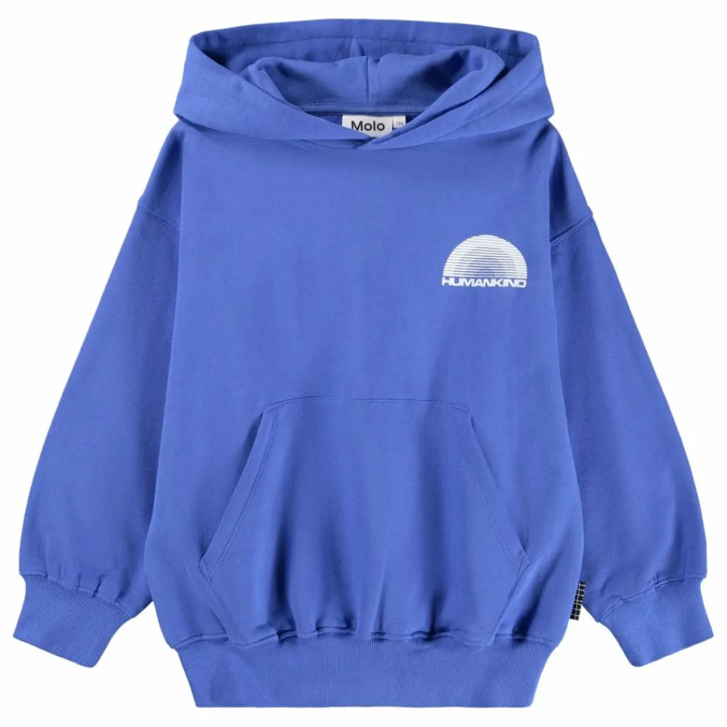 - Ce sweat à capuche bleu de Molo est fabriqué en coton biologique et comporte une poche kangourou ainsi que des poignets et un ourlet côtelés. Le sweat à capuche est imprimé en blanc d’un soleil et du texte « Humankind ».