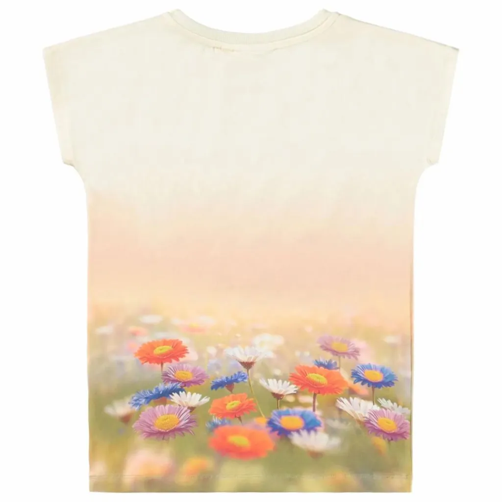 - Ce T-shirt orange clair de Molo est fabriqué en coton biologique et comporte un imprimé sur le devant représentant un lapin dans un champ de fleurs coloré. Ce t-shirt a une coupe régulière, de petites manches courtes, une encolure côtelée et un dos plus long.
