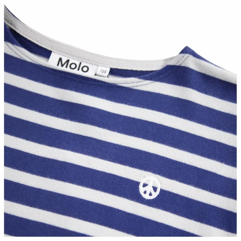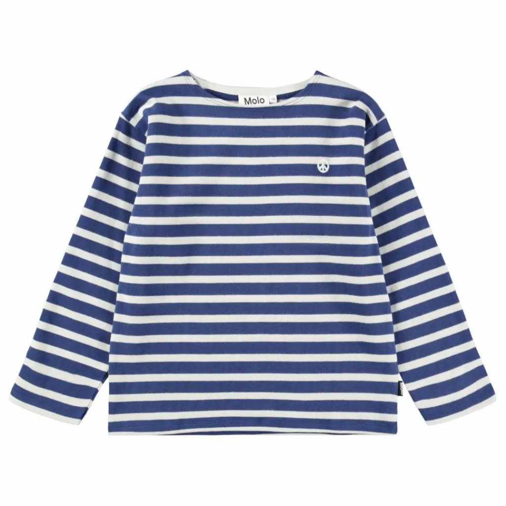 - Cette blouse rayée bleue et blanche de Molo est fabriquée en coton biologique doux et comporte des manches longues et un ruban intérieur à l’encolure. La blouse a une coupe ample et comporte un petit signe de paix brodé sur la poitrine.