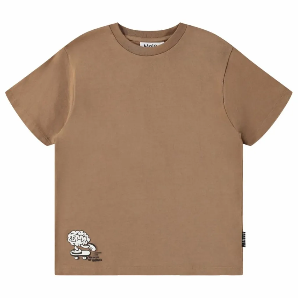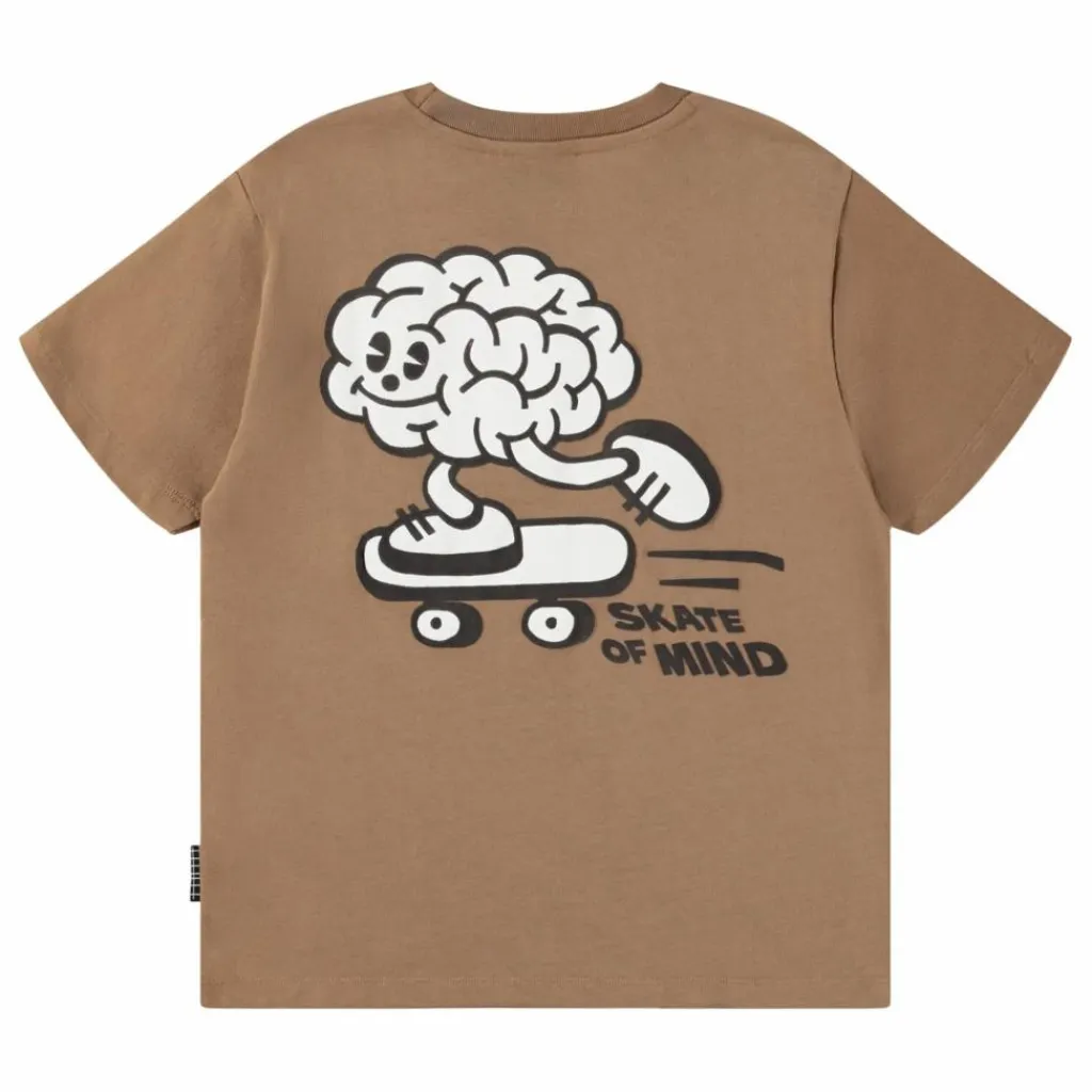 - Ce T-shirt marron de Molo est fabriqué en coton biologique doux, avec des manches courtes et une encolure côtelée. Ce t-shirt à la coupe oversize est imprimé au dos d’un cerveau sur un skateboard et du texte « Skate of mind ». Il est recommandé de choisir une taille plus petite pour une coupe moins ample, surtout si l’enfant est entre deux tailles.