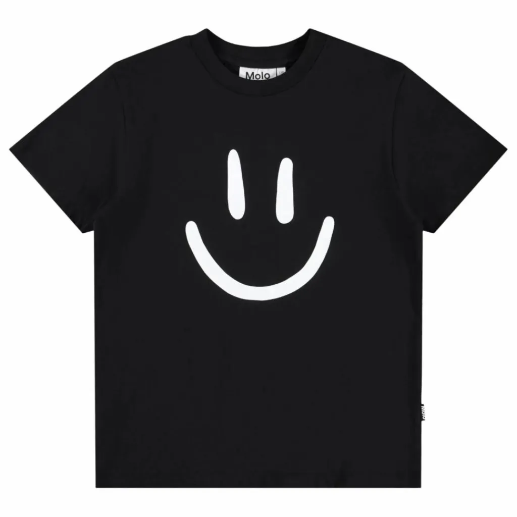- Ce T-shirt noir de Molo est fabriqué en coton biologique doux, avec des manches courtes et une encolure côtelée. Le T-shirt a une coupe ample et un imprimé blanc d’un visage souriant sur le devant.