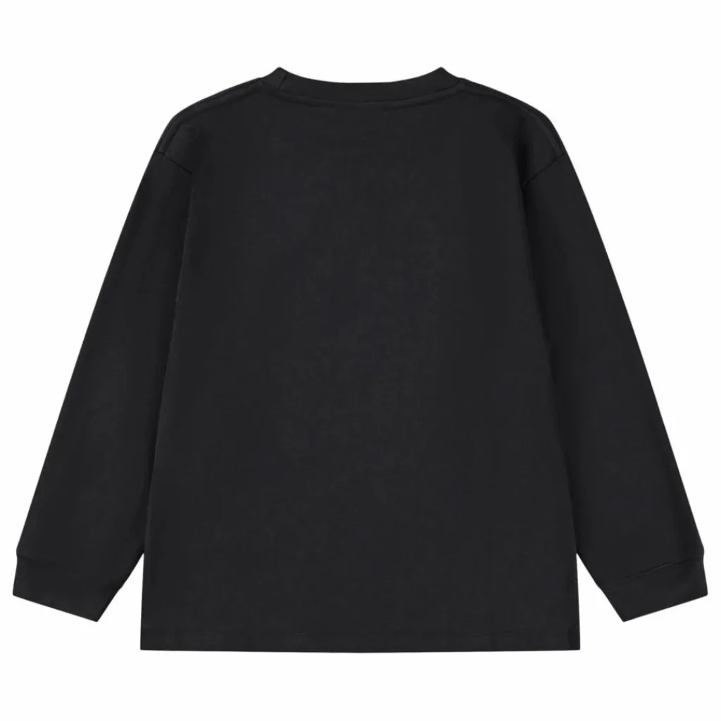 - Ce haut noir à manches longues de Molo est fabriqué en coton biologique et présente une encolure et des manches côtelées. Il présente une coupe ample et est imprimé sur le devant d’un chat sur un skateboard.
