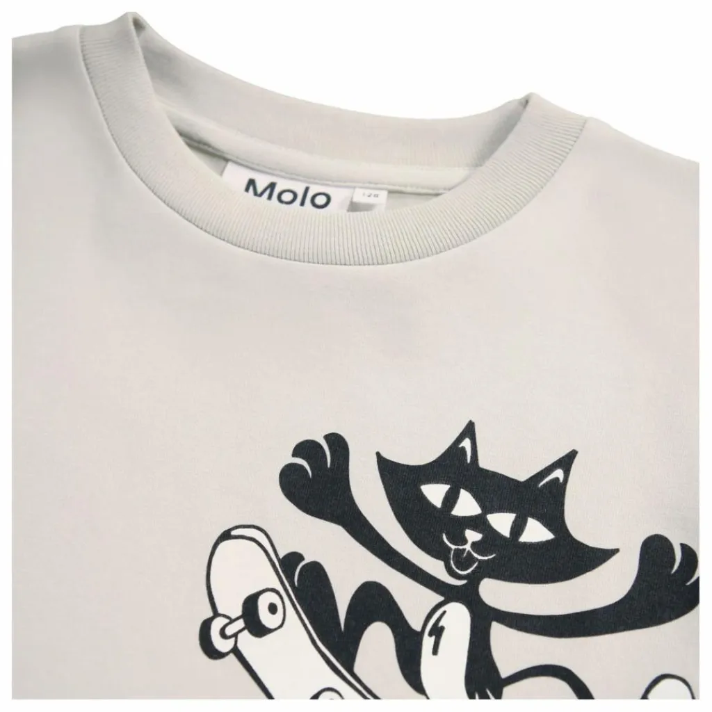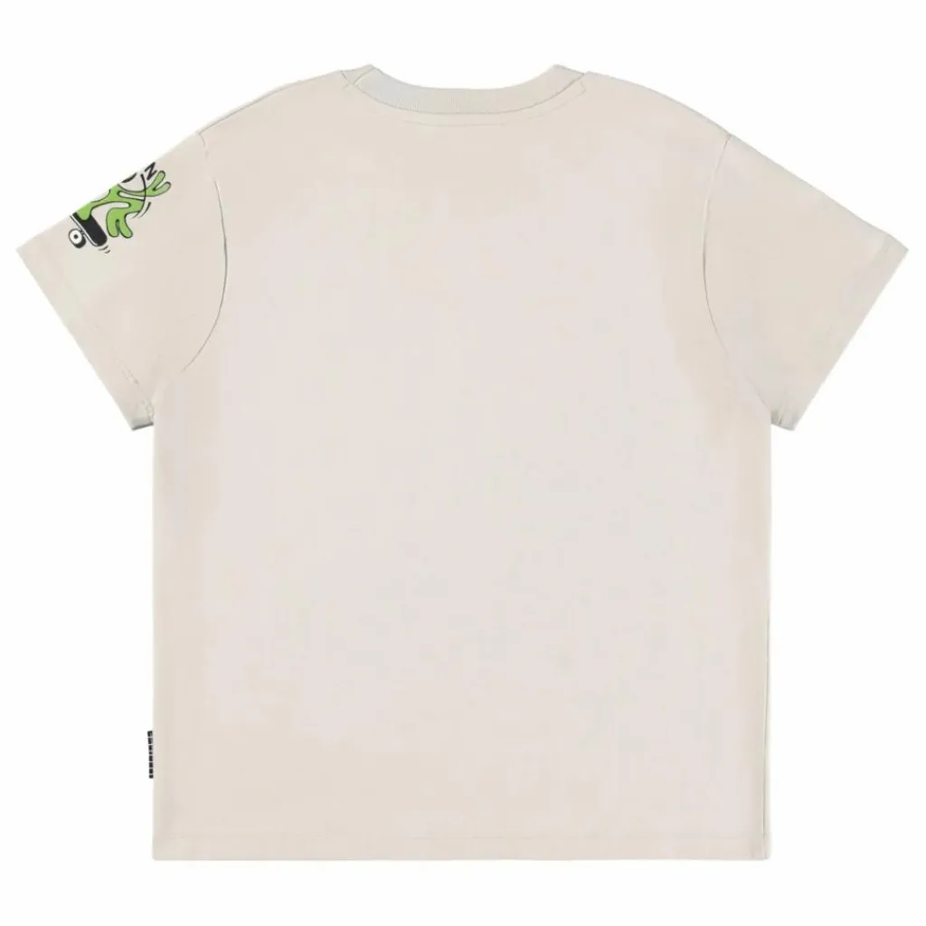 - Ce t-shirt beige de Molo est fabriqué en coton biologique doux et présente des manches courtes et une encolure côtelée. Ce t-shirt à la coupe oversize est imprimé d’un chat, d’un extraterrestre et d’un cerveau sur un skateboard. Il est recommandé de choisir une taille plus petite pour une coupe moins ample, surtout si l’enfant est entre deux tailles.