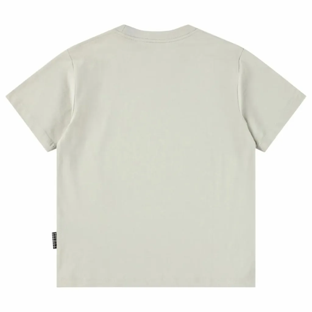 - Ce t-shirt blanc cassé de Molo est fabriqué en coton biologique doux, avec des manches courtes et une encolure côtelée. Ce t-shirt à la coupe ample est imprimé sur le devant d’un visage souriant en train de fondre.