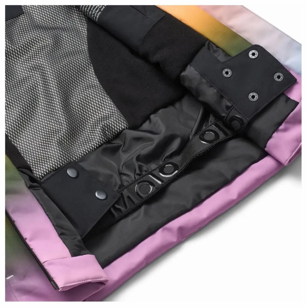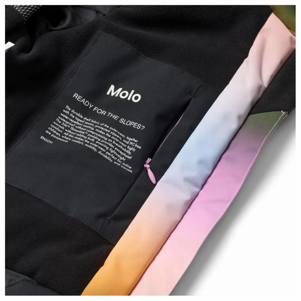 - Cette veste d’hiver aux couleurs de l’arc-en-ciel de Molo est imperméable au vent et à l’eau et fabriquée en polyester recyclé. La veste est dotée d’une capuche doublée, d’une fermeture à glissière frontale avec rabat, ainsi que de poches à glissière imperméables. Une poche sur la manche permet de ranger un forfait de ski et une poche intérieure offre un espace de rangement supplémentaire. La veste est équipée d’un rabat coupe-vent à la taille, de velcro aux poignets et d’ouvertures pour les manches avec des trous pour les pouces, qui empêchent efficacement la neige, le vent et l’eau de pénétrer dans la veste. En outre, la veste est doublée de polaire et rembourrée de 3M™ Thinsulate™ et d’un réflecteur de texte pour être visible dans la circulation. Caractéristiques : – Coupe-vent et imperméable – Pression de la colonne d’eau : 20 000 mm – Respirabilité : 20 000 g/m2/24h – 3M™ Thinsulate™ (température jusqu’à -25°C) – Sans PFC (PFOS et PFOA) – Rabat coupe-vent et velcro autour de la taille et des manches – Capuche doublée – Fermetures à glissière imperméables – Réflecteur pour augmenter la visibilité dans la circulation.