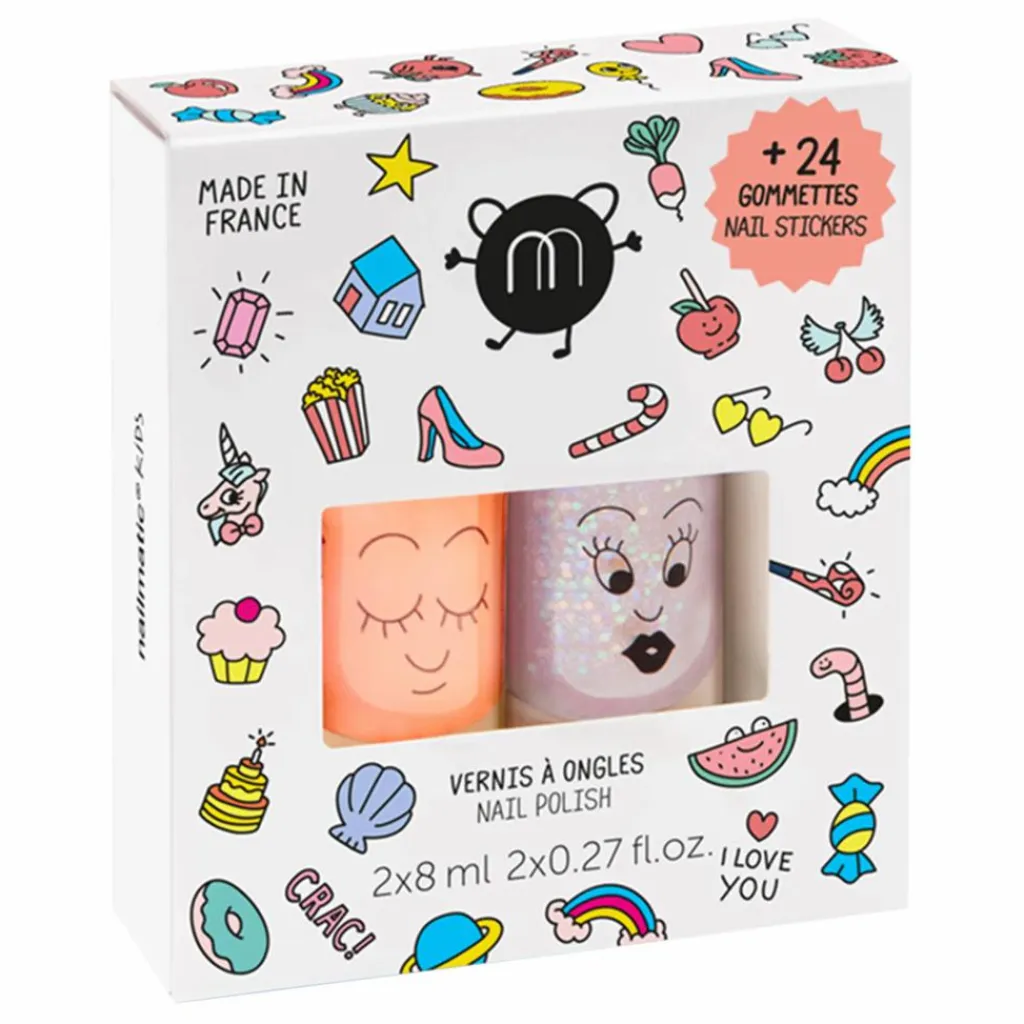 - Ce coffret contient 2 vernis à ongles formulés à l’eau : Flamingo (corail néon) + Polly (rose pailleté) et 1 planche de 24 stickers pour ongles (adaptés aux petits doigts).
