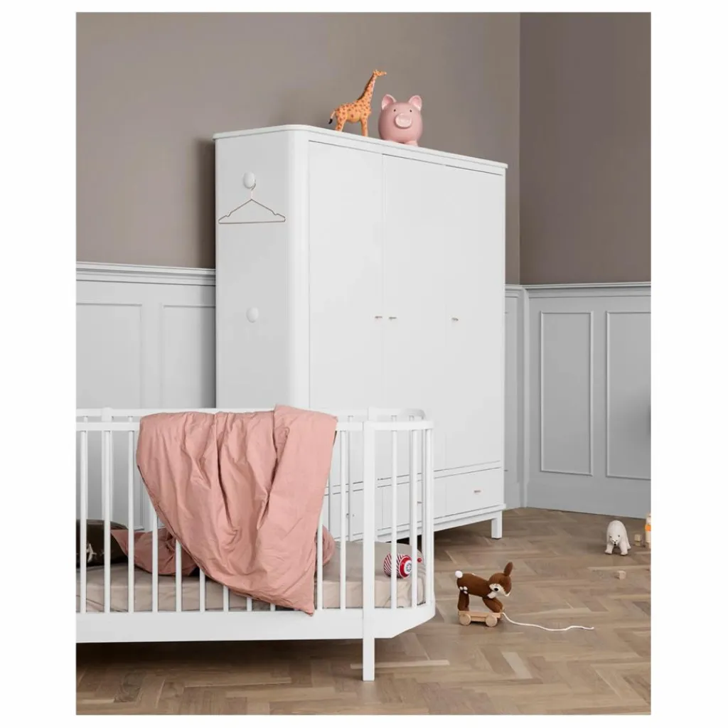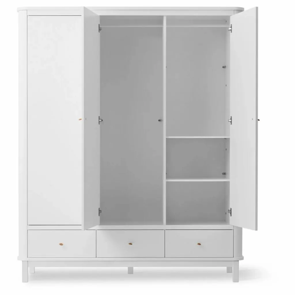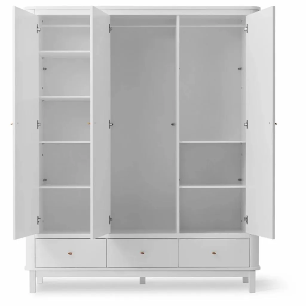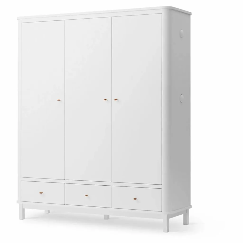 - L’armoire Wood est conçue comme un meuble aux multiples fonctions. Ses bords arrondis lui offrent une légèreté visuelle. Elle dispose de deux crochets intégrés de chaque cotés, afin de suspendre peignoir, tenue du jour, etc. Ils s’intègrent parfaitement à l’armoire ce qui leur créer une fonction à la fois décorative et pratique. L’intérieur de l’armoire peut être configuré avec des étagères flexibles, mais les tiroirs du bas sont des éléments fixes.