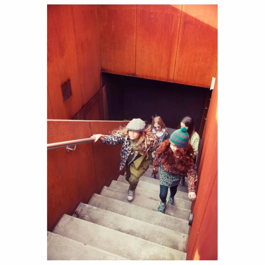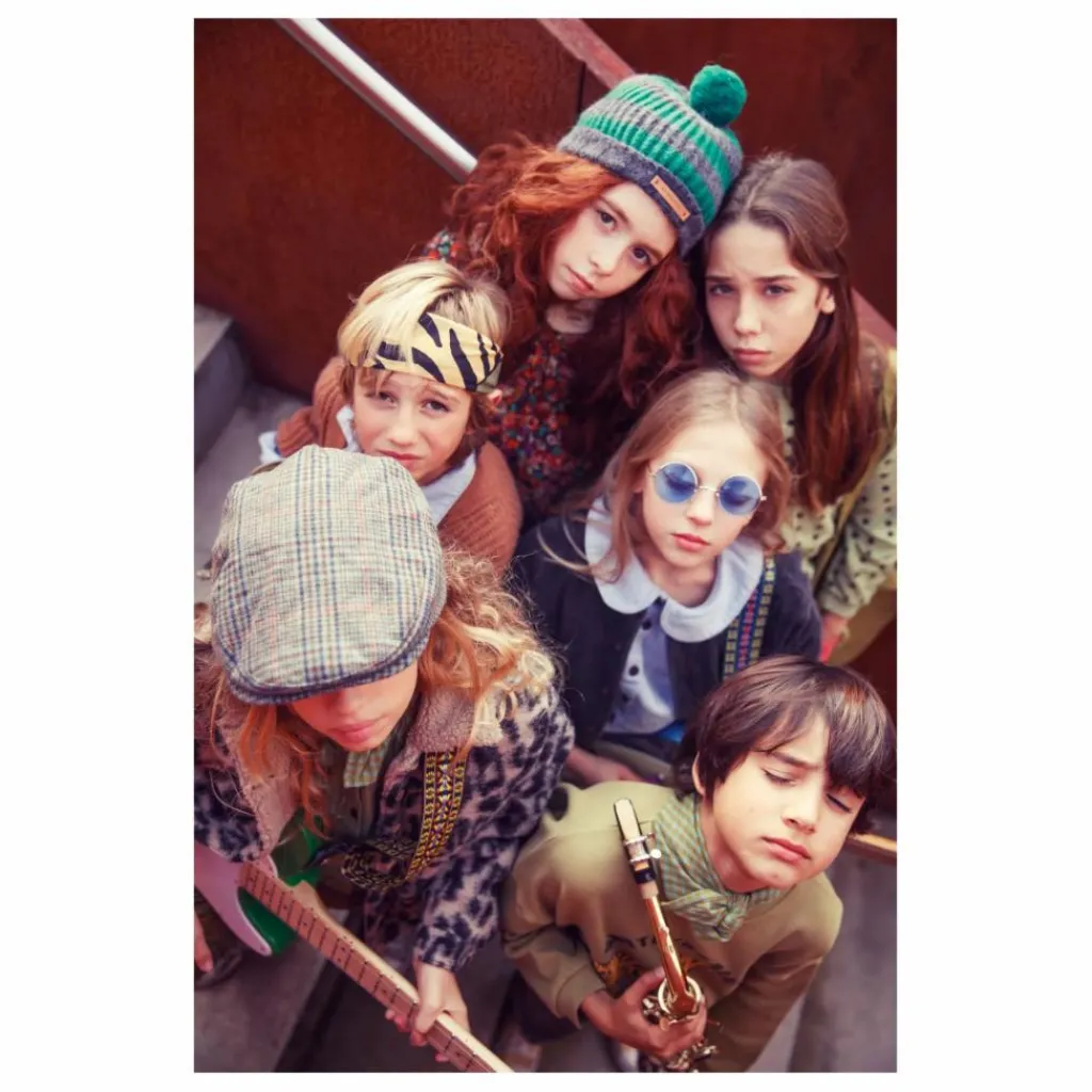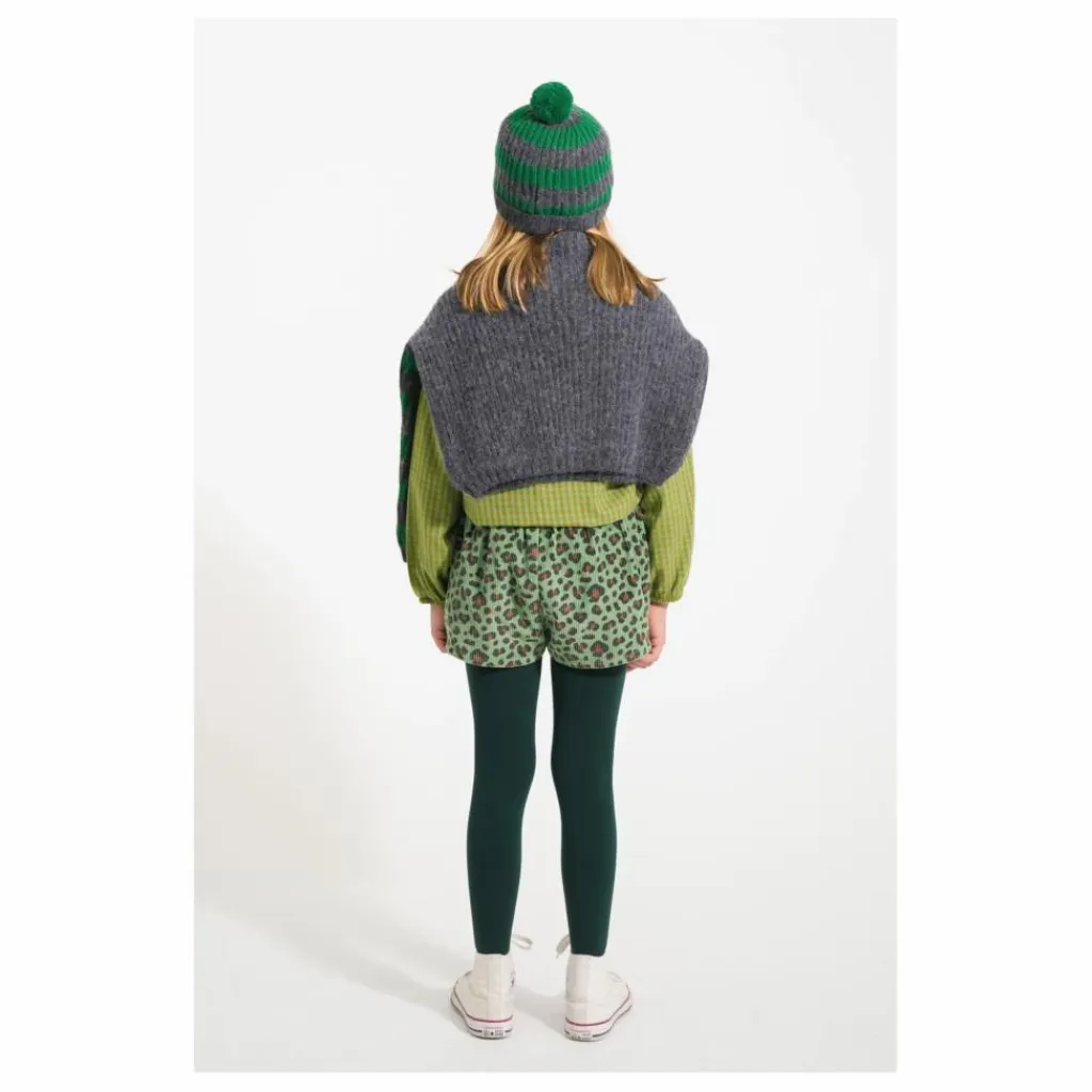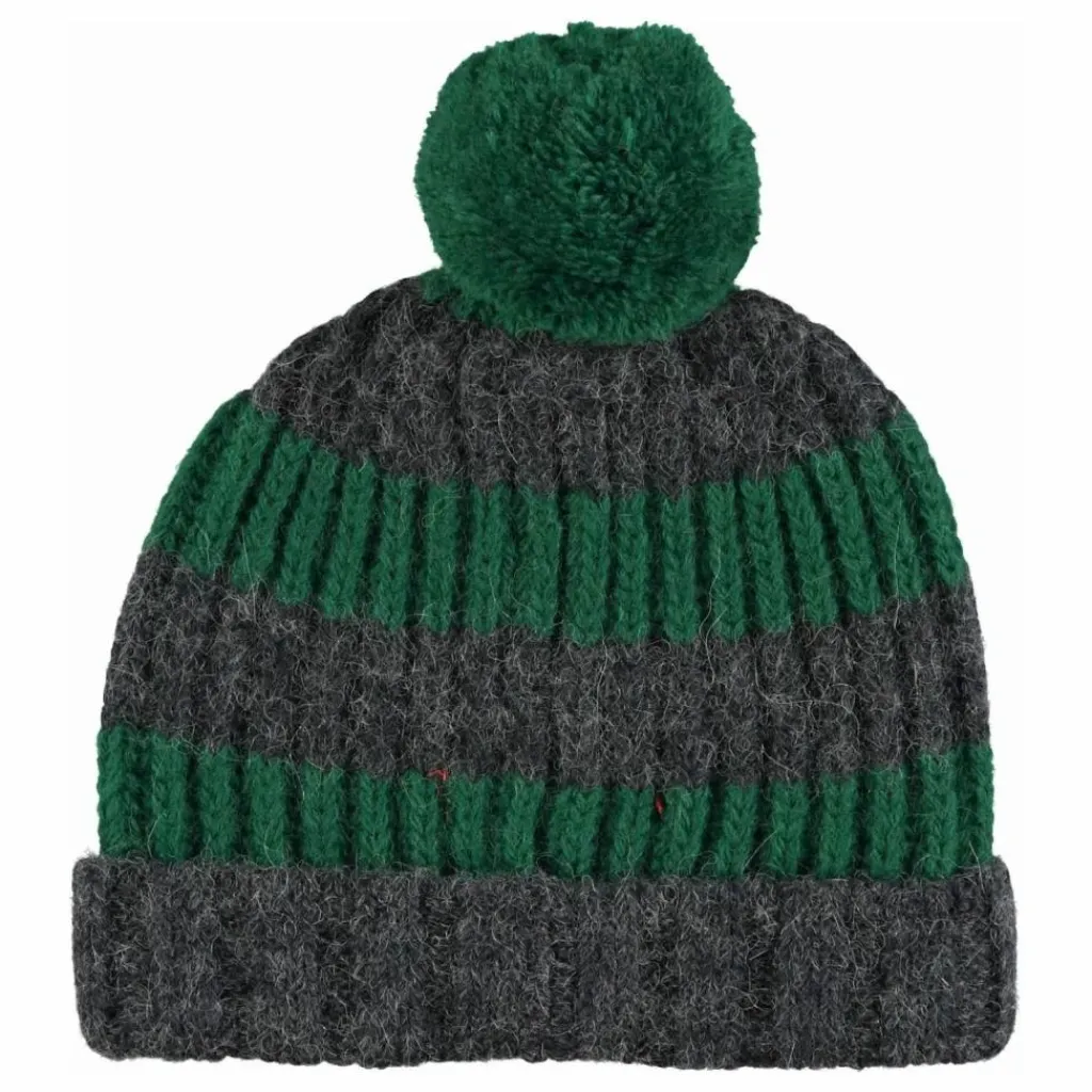 - Bonnet tricoté avec pompon vert. Étiquette en cuir.