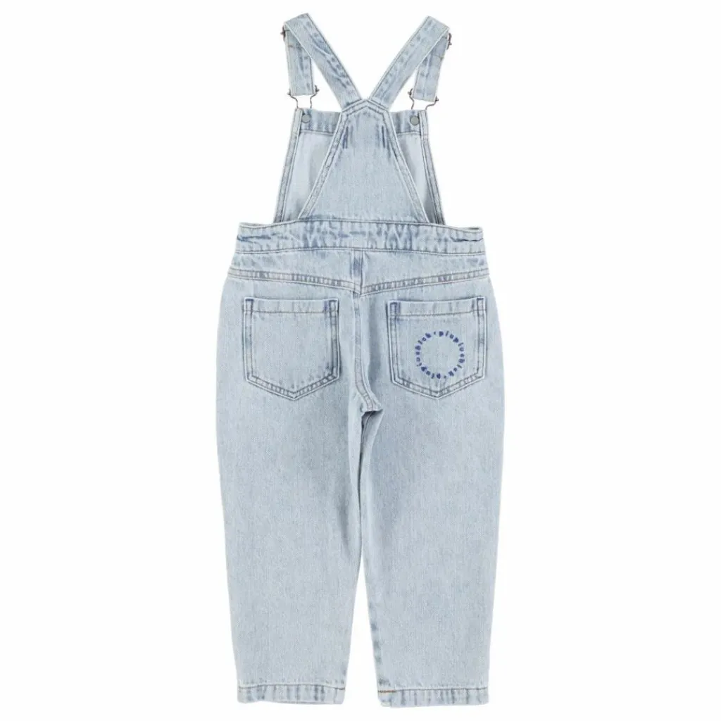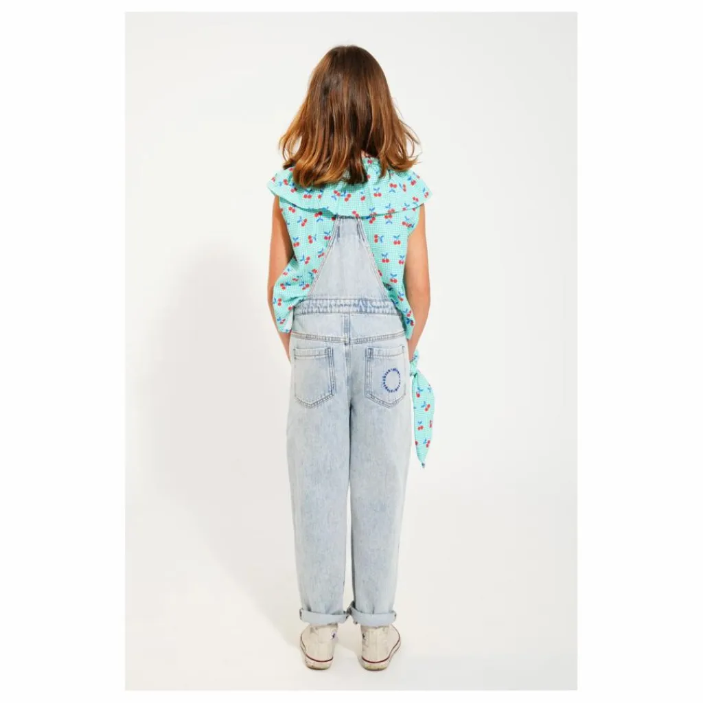 - Salopette en denim avec bretelles réglables. Elle est ornée d’un logo en cuir sur la poche de poitrine et d’une broderie bleue sur la poche arrière.