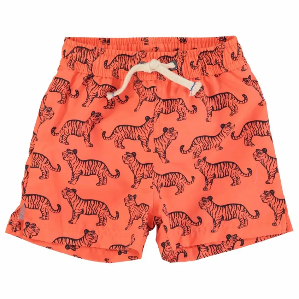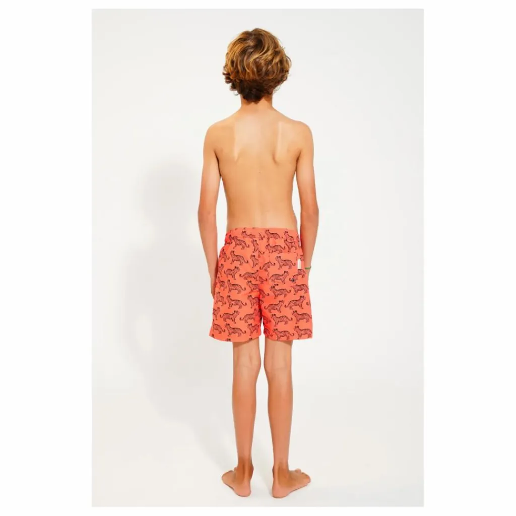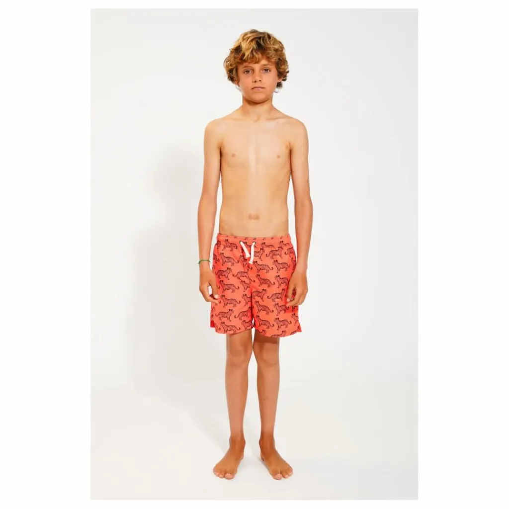 - Short de bain avec taille élastiquée et cordon de serrage, sous-vêtements en maille et fente sur le côté.