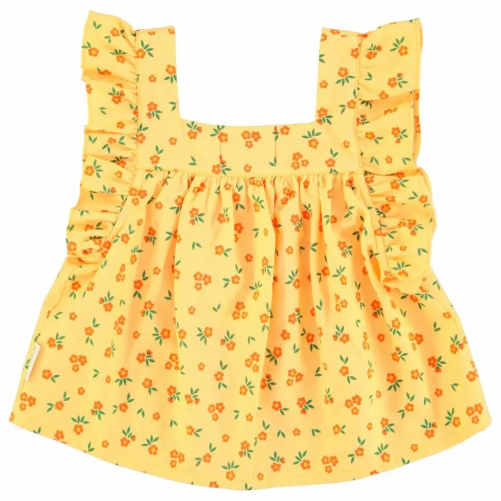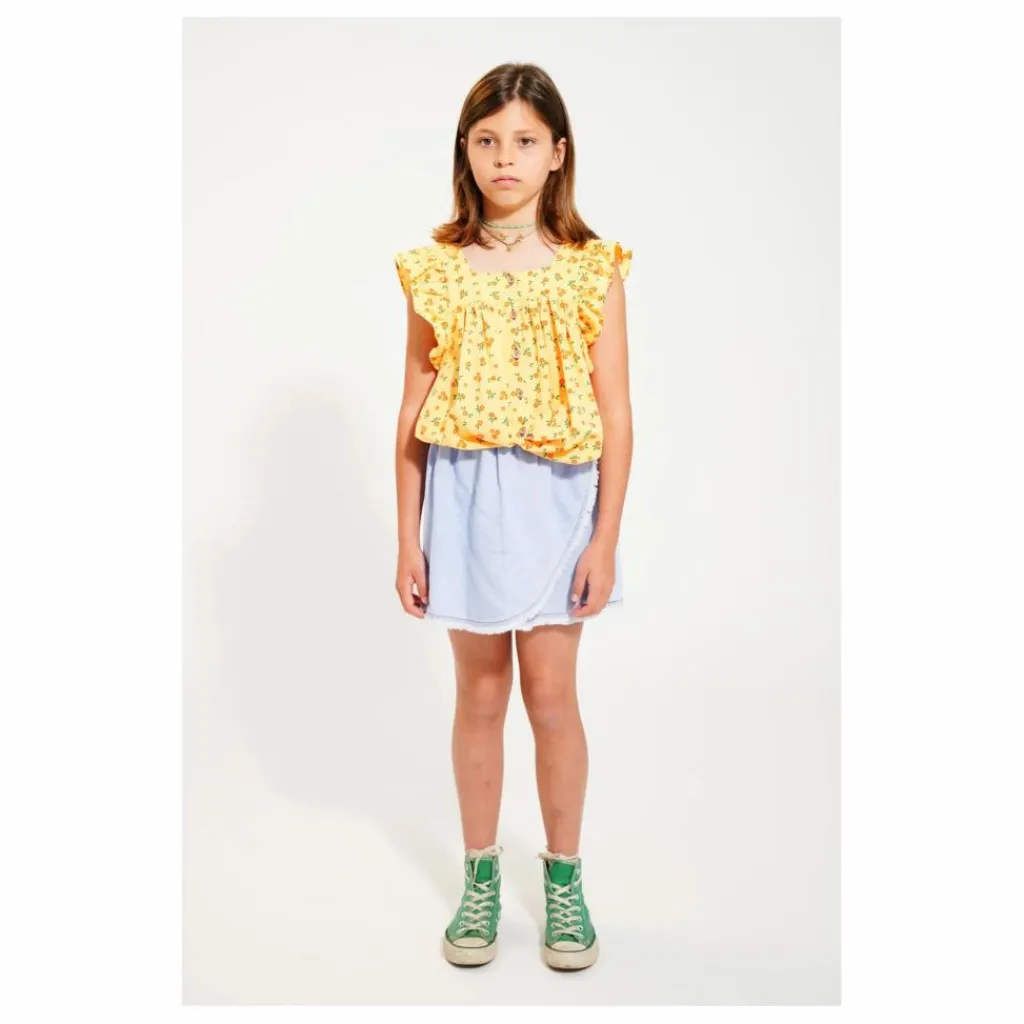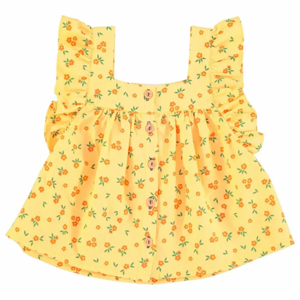 - Chemisier sans manches à encolure carrée. Boutons en bois sur le devant. Manches à volants.