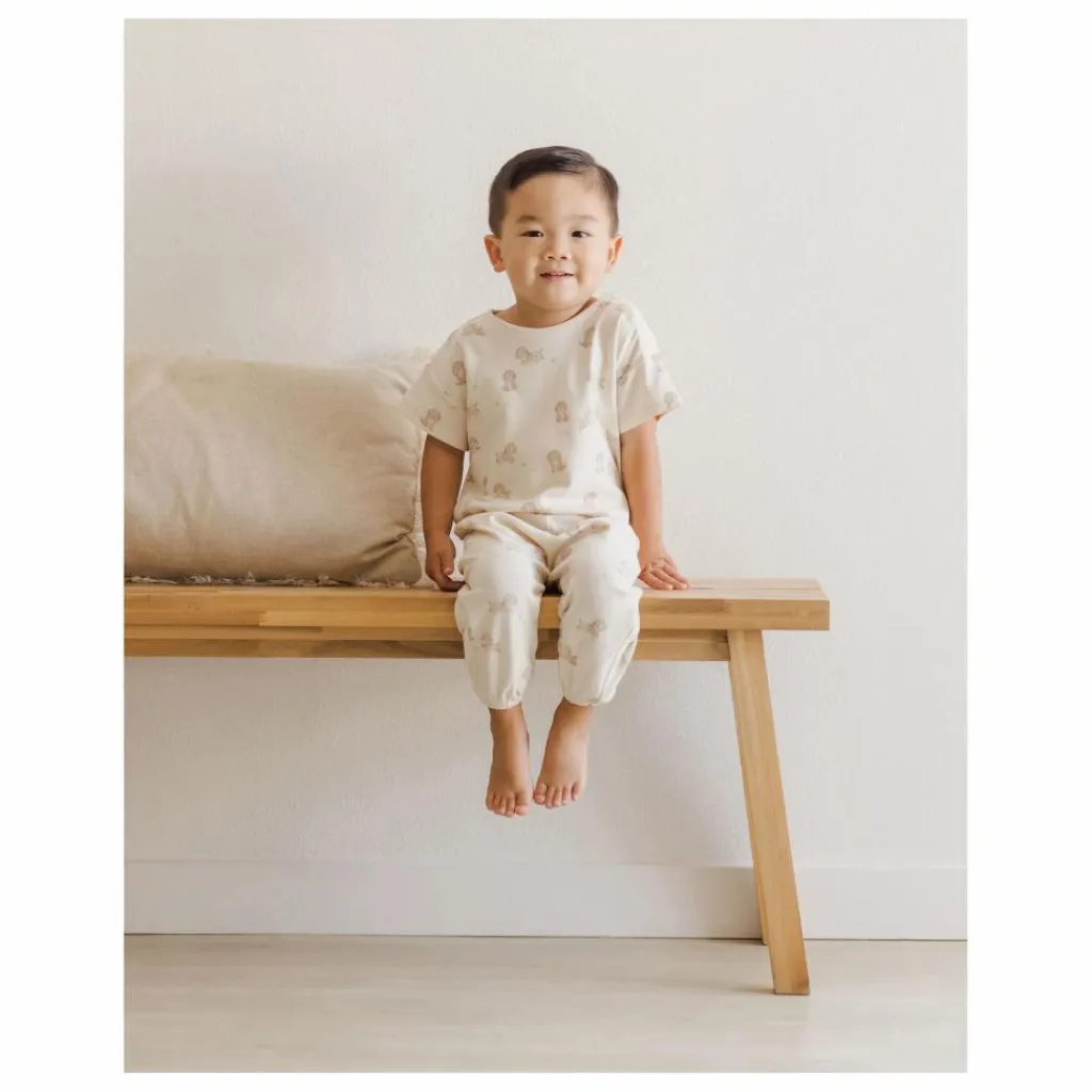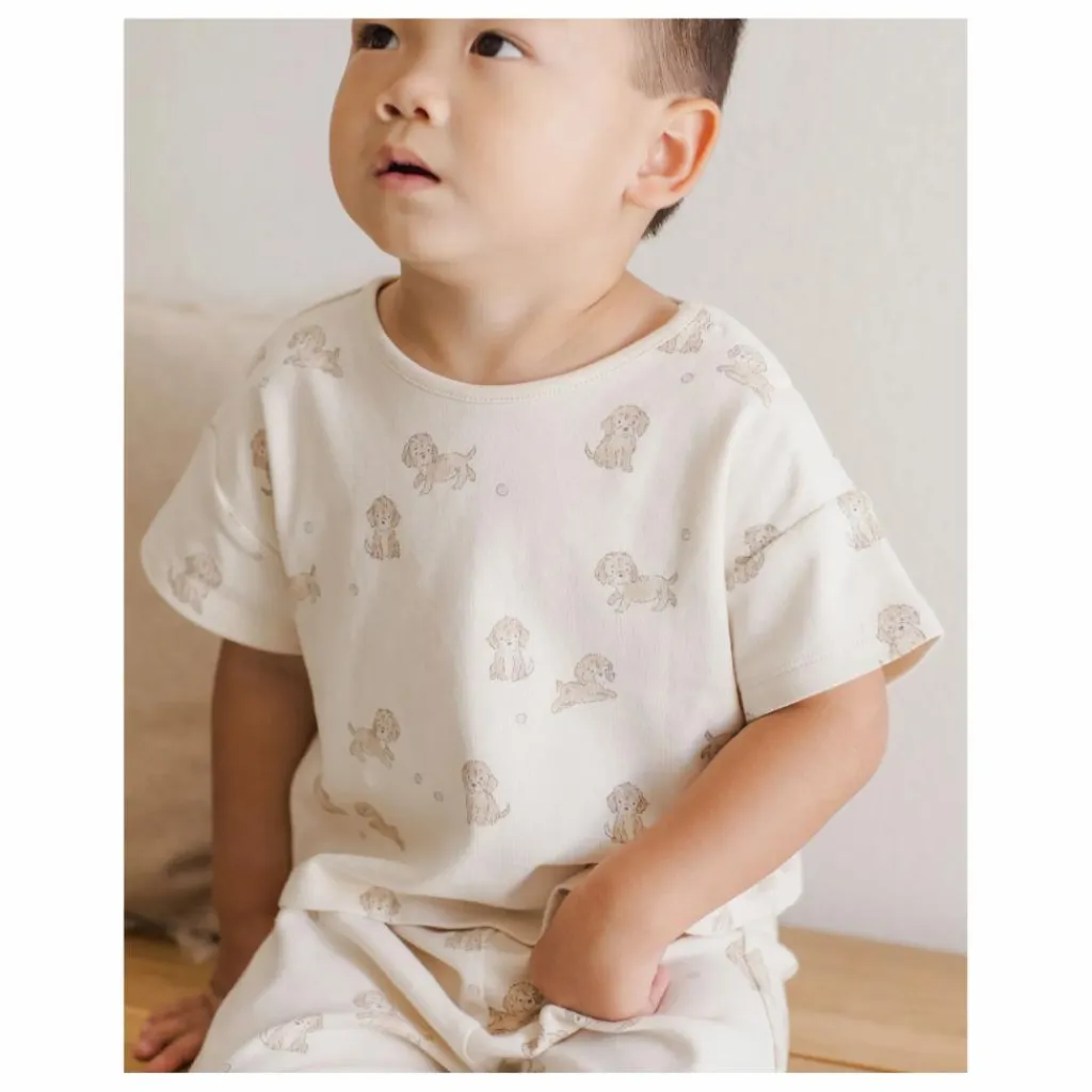- L’ensemble parfait pour se détendre et jouer ! Notre ensemble tee-shirt et pantalon en jersey sera certainement l’un de vos meilleurs choix de garde-robe, avec notre imprimé » chiots » dans notre teinte » naturelle « . Un imprimé chiot amusant pour vos petits enfants espiègles.